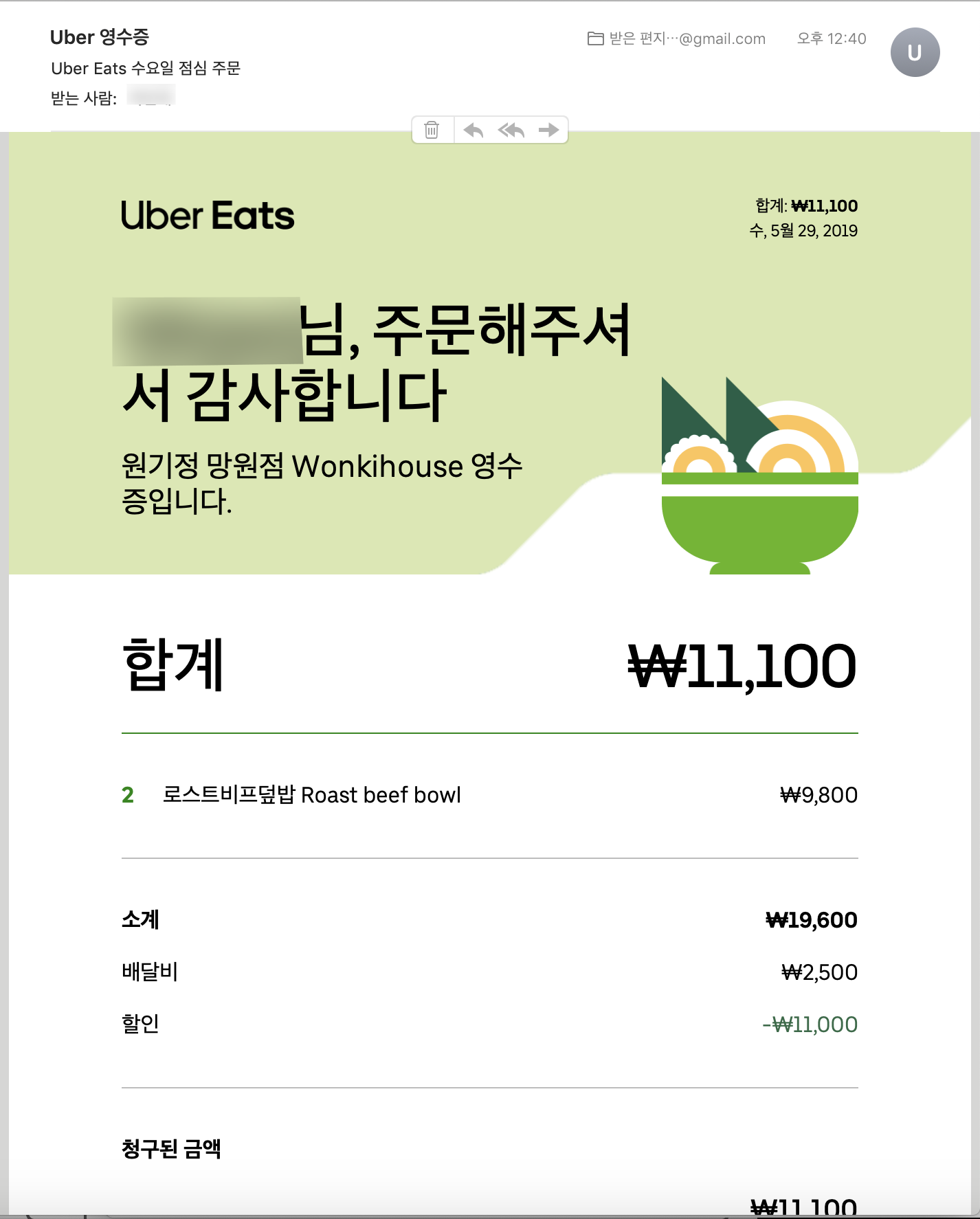 '원기정 망원점'에서 '로스트비프덮밥' 2개를 11,100원에 주문 할 수 있었다. 싸다!
