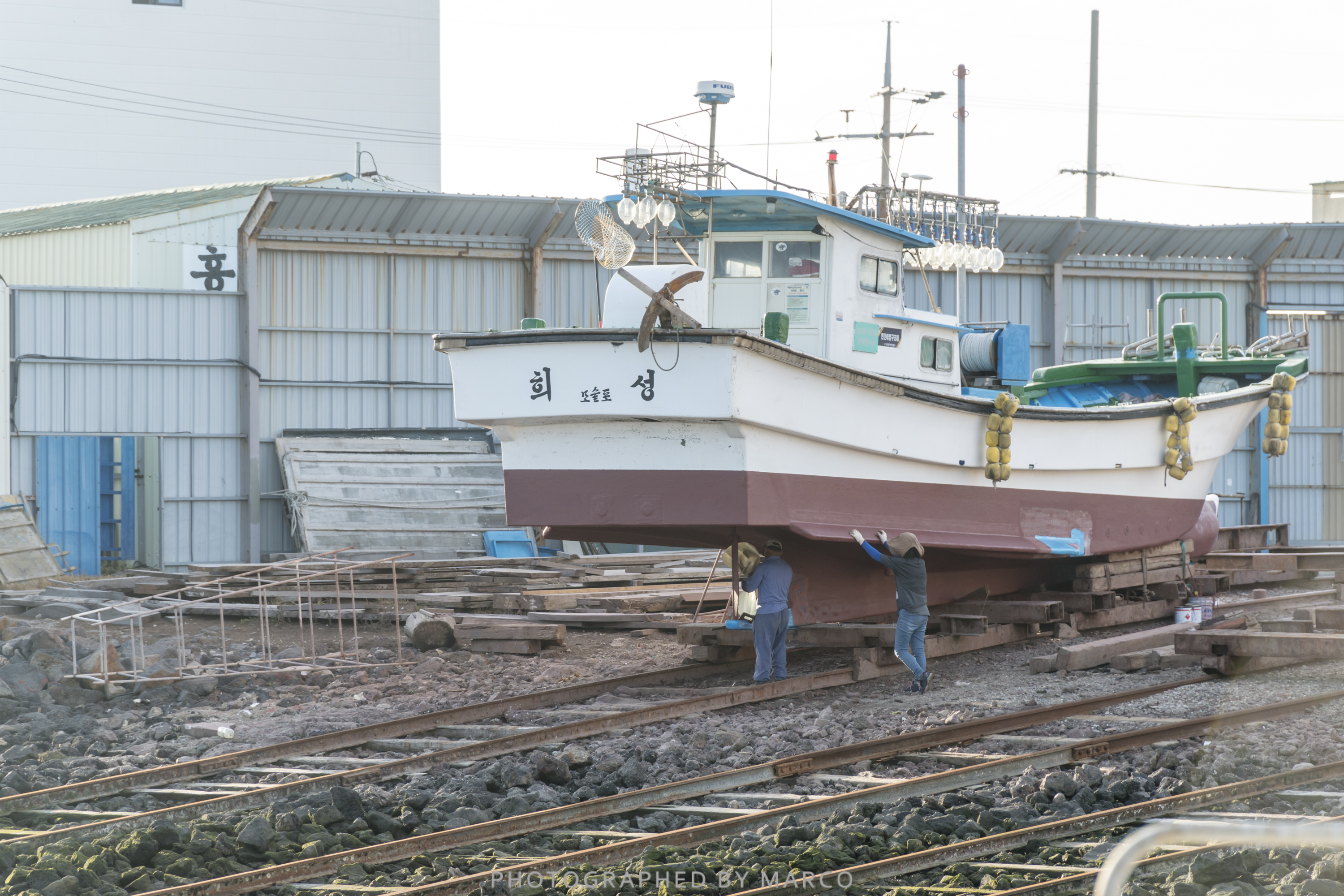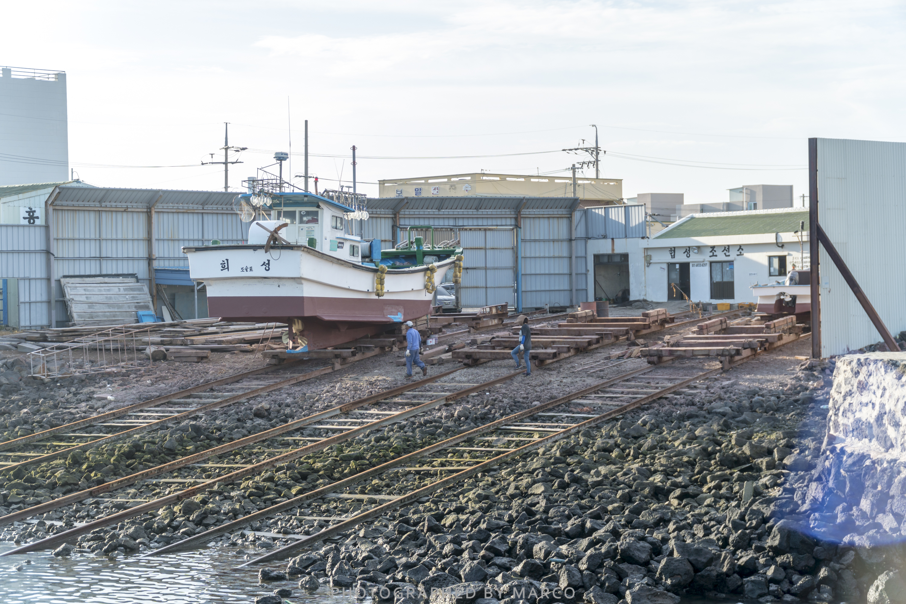 저 멀리 고깃배를 수리하는 조선소의 모습이 보인다.