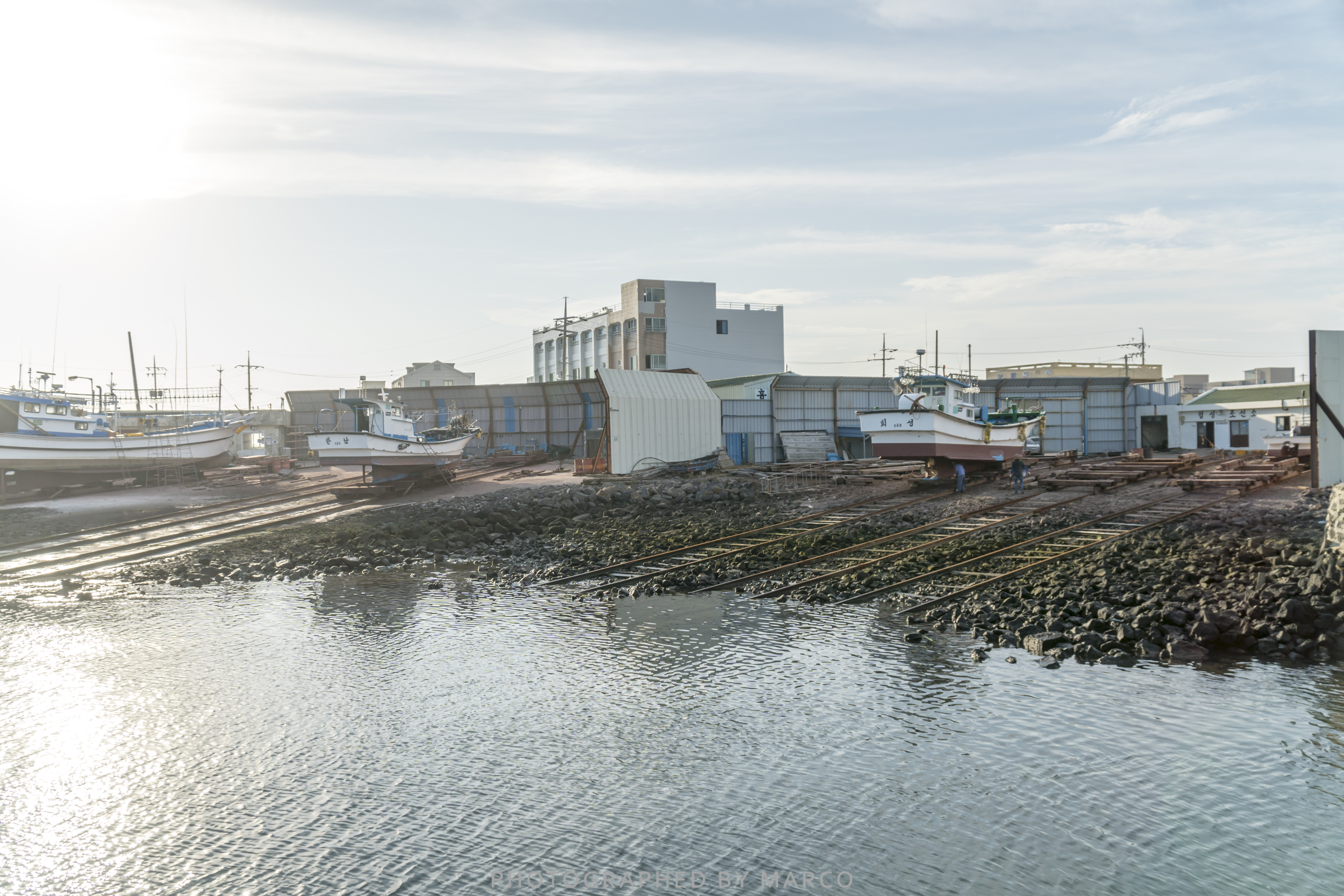 저 멀리 고깃배를 수리하는 조선소의 모습이 보인다.