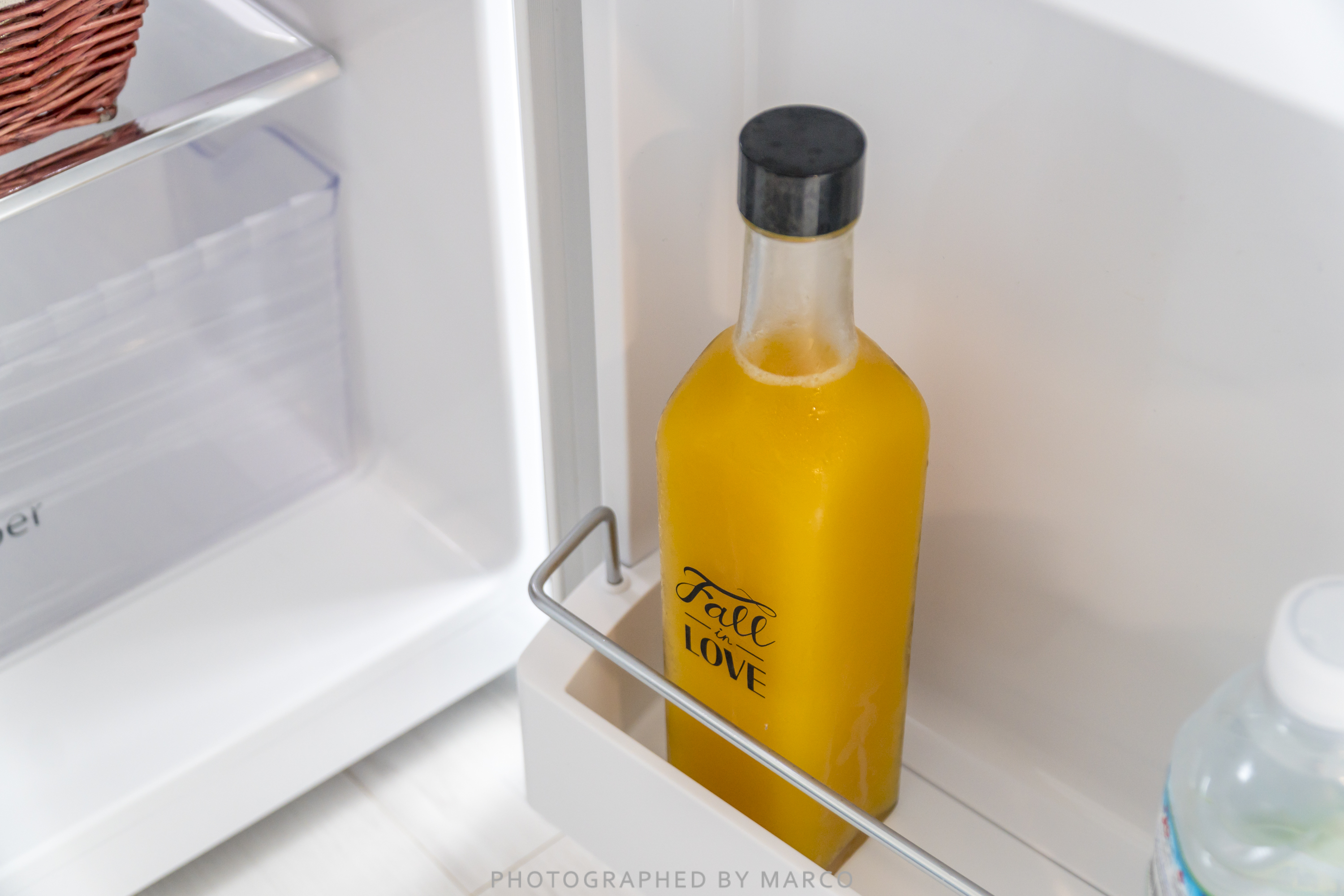 냉장고 안에는 식빵과 오렌지 주스, 그리고 생수가 있다.