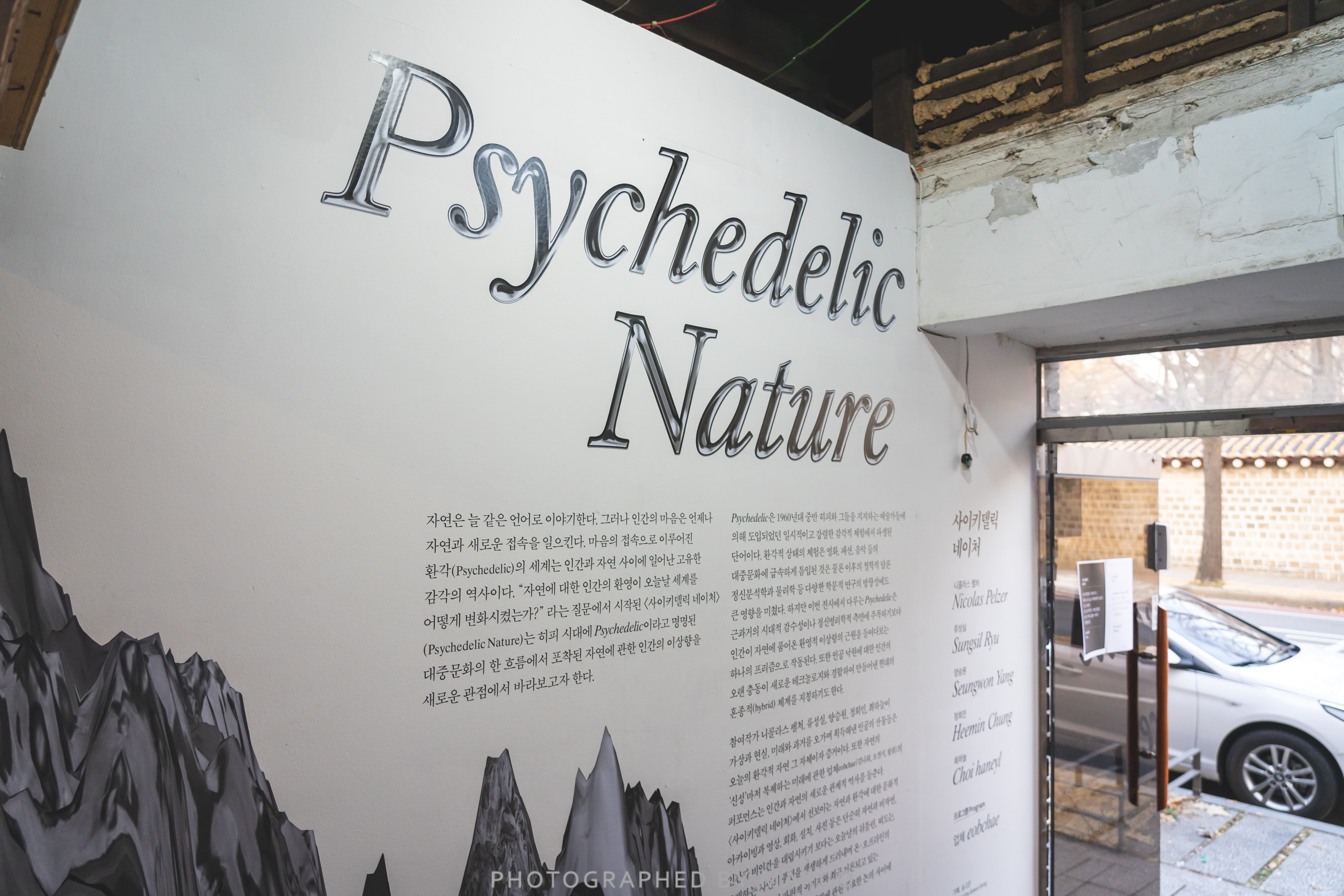 자연은 늘 같은 언어로 이야기한다. 하지만 인간의 마음은 언제나 자연과 새로운 접속을 일으킨다. “자연에 대한 인간의 환영은 오늘날 세계를 어떻게 변화시켰을까?”라는 질문에서 출발한 <사이키델릭 네이처>(Psychedelic Nature)는 인공 낙원의 혼종적(hybrid) 자연를 지칭하는 Psychedelic을 다룬다. 니콜라스 펠처(Nicolas Pelzer), 류성실, 양승원, 정희민, 최하늘이 …