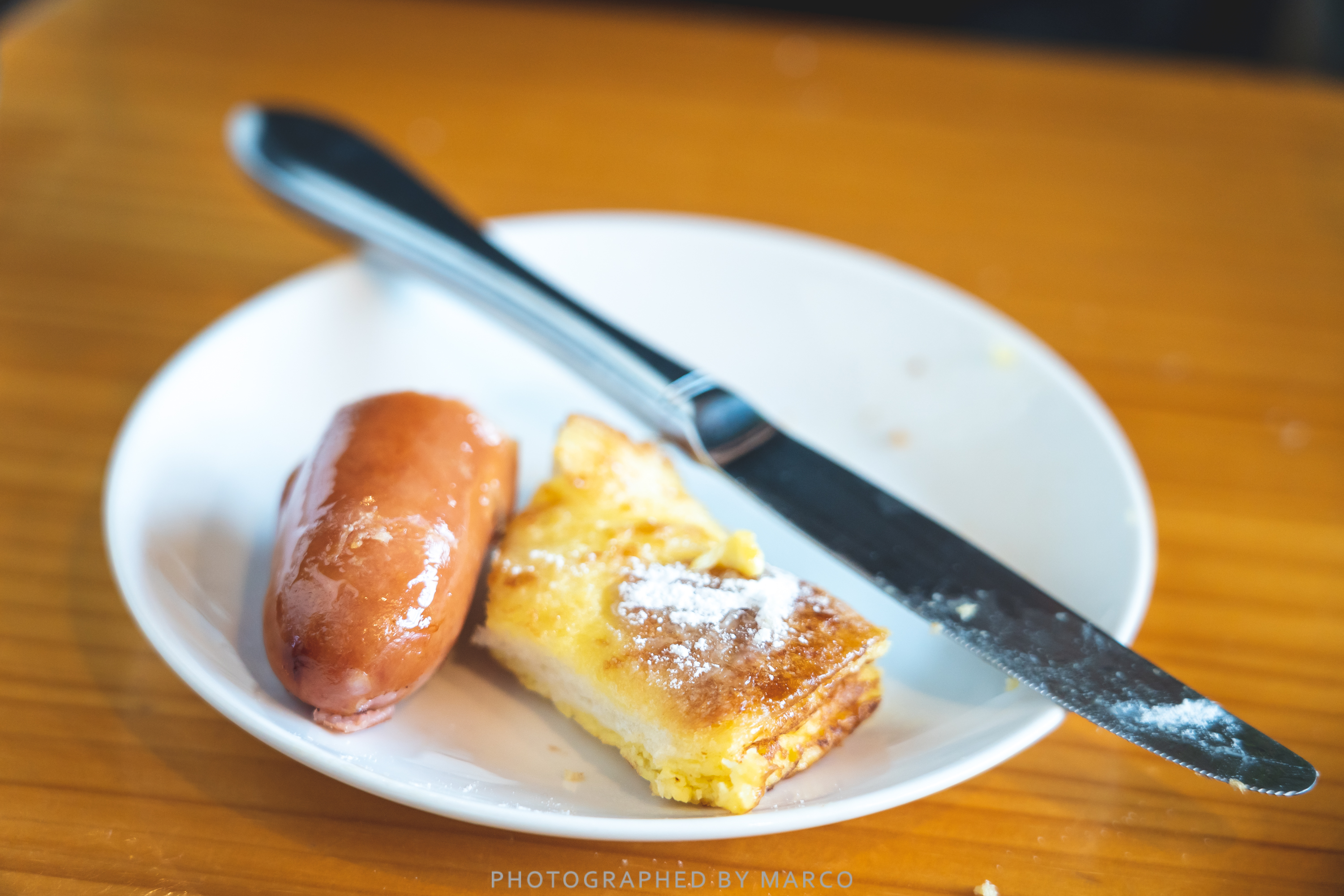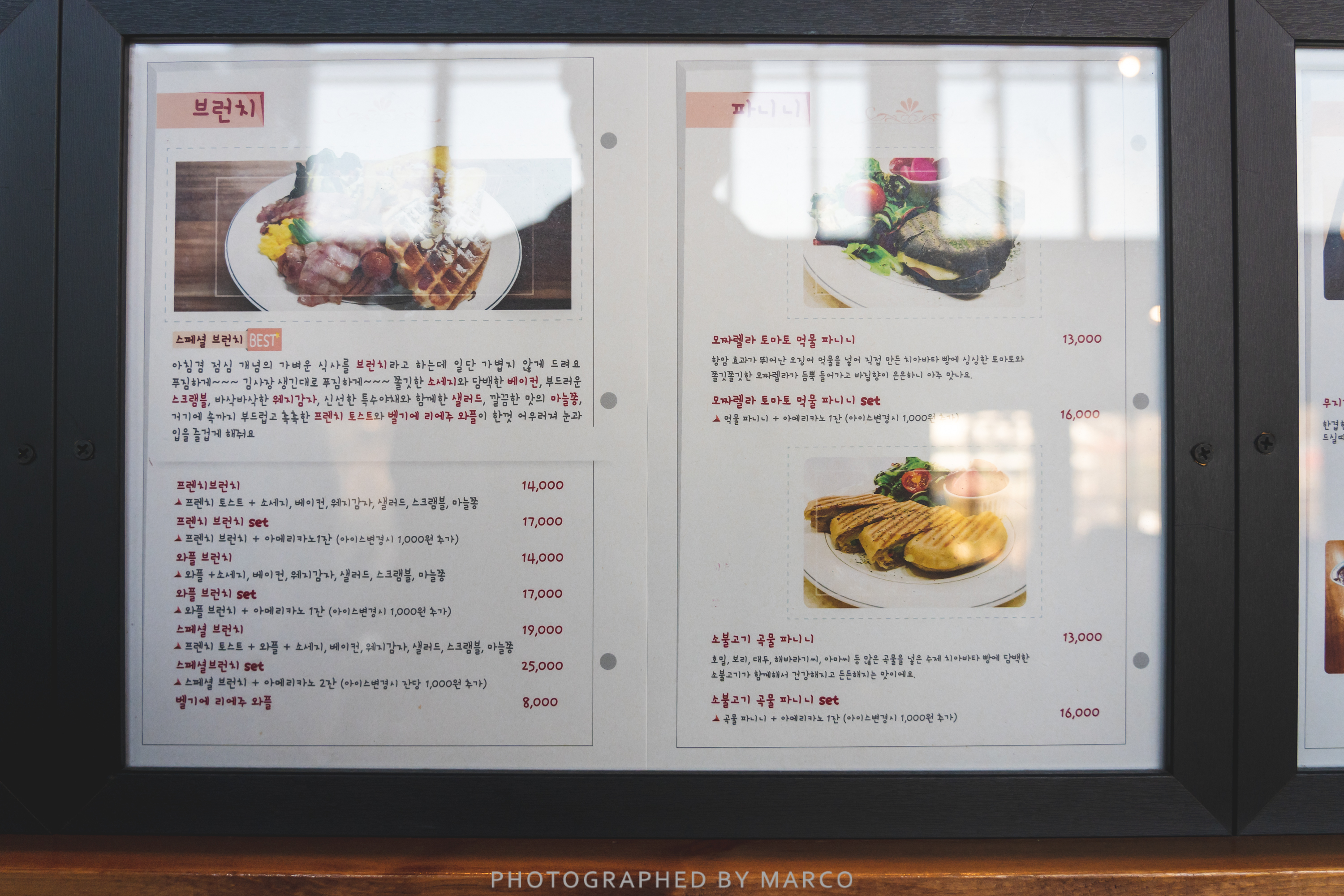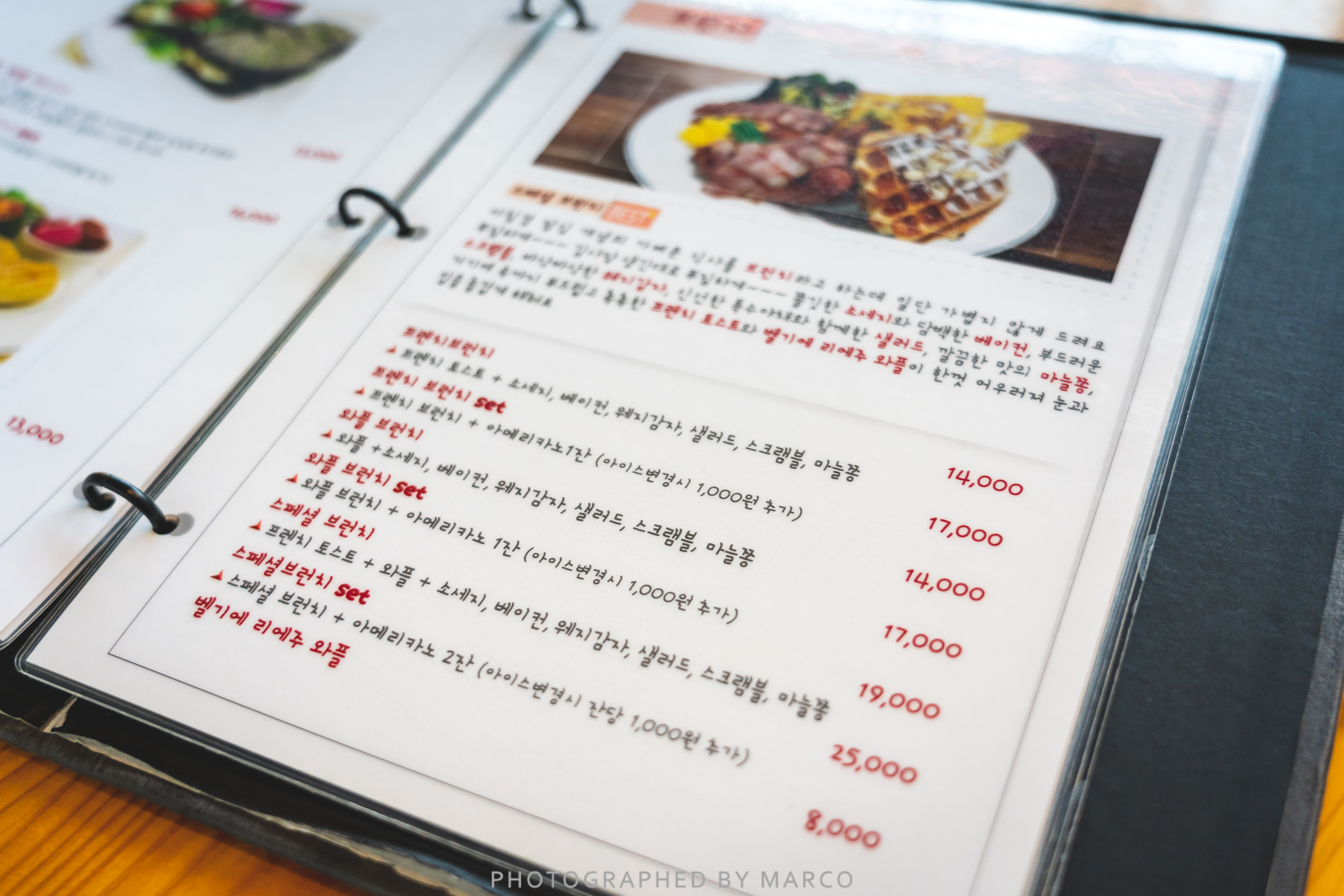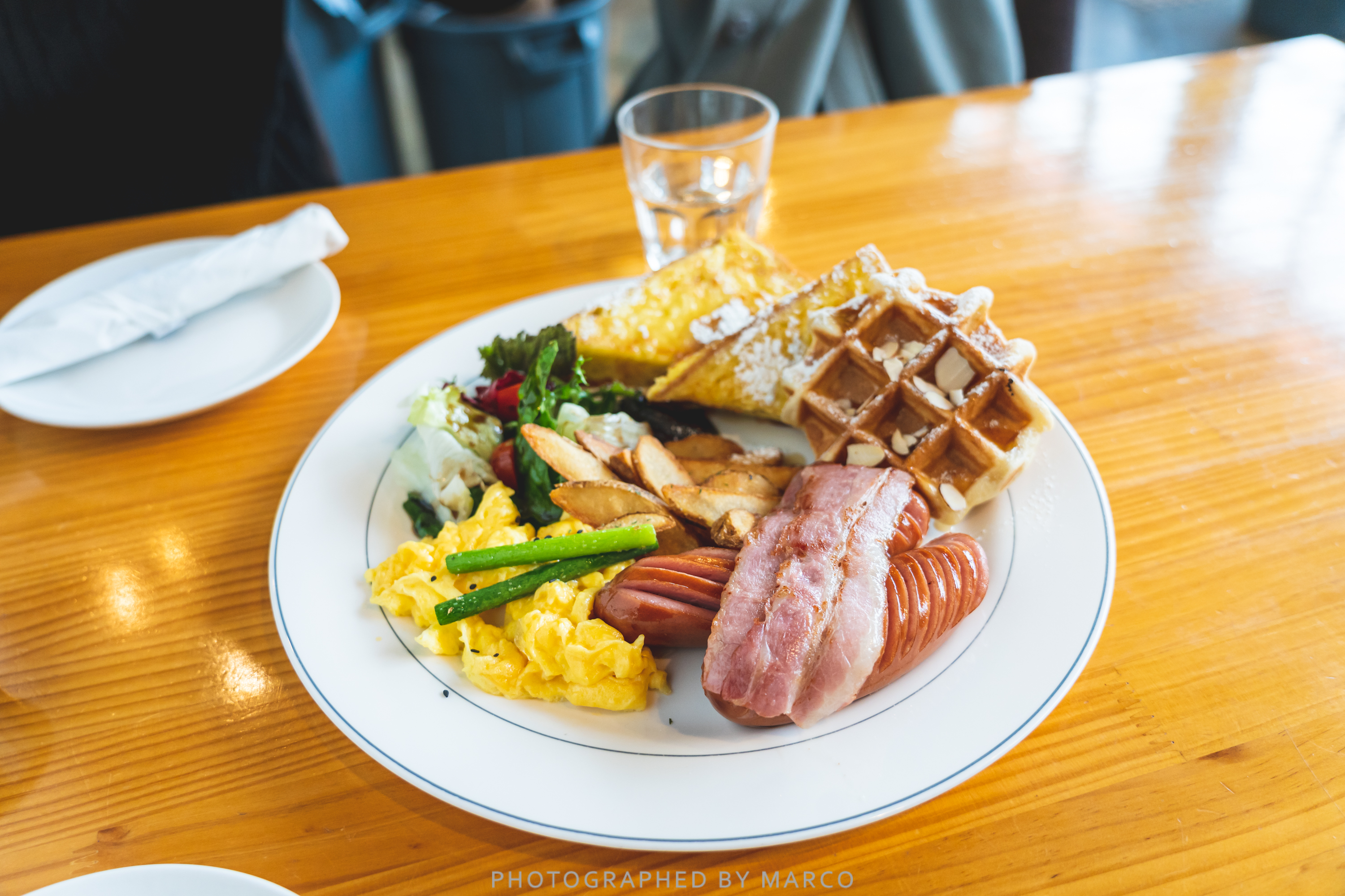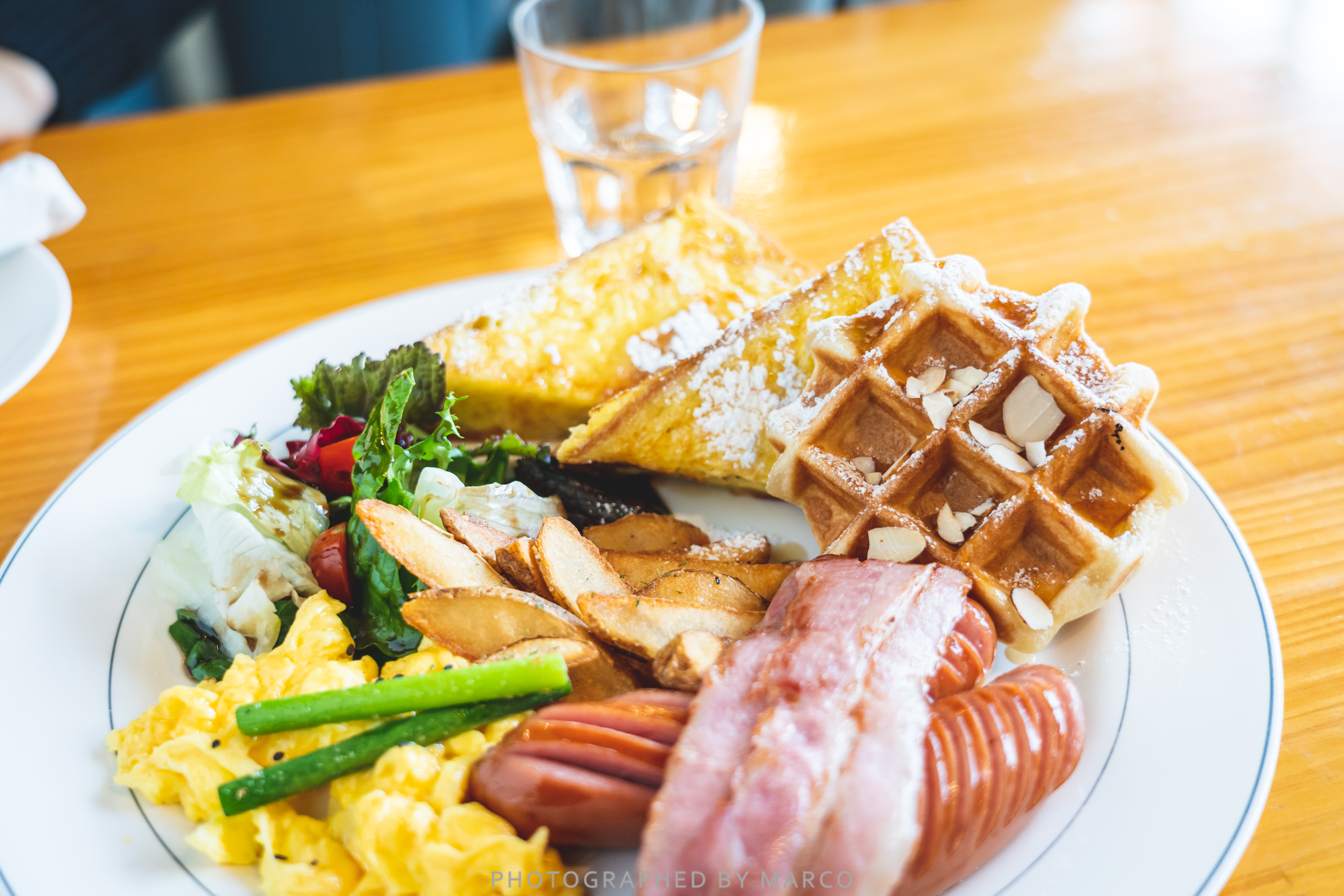 프렌치토스트, 와플, 베이컨, 스크램블, 감자, 소시지, 샐러드로 구성되어 있다.