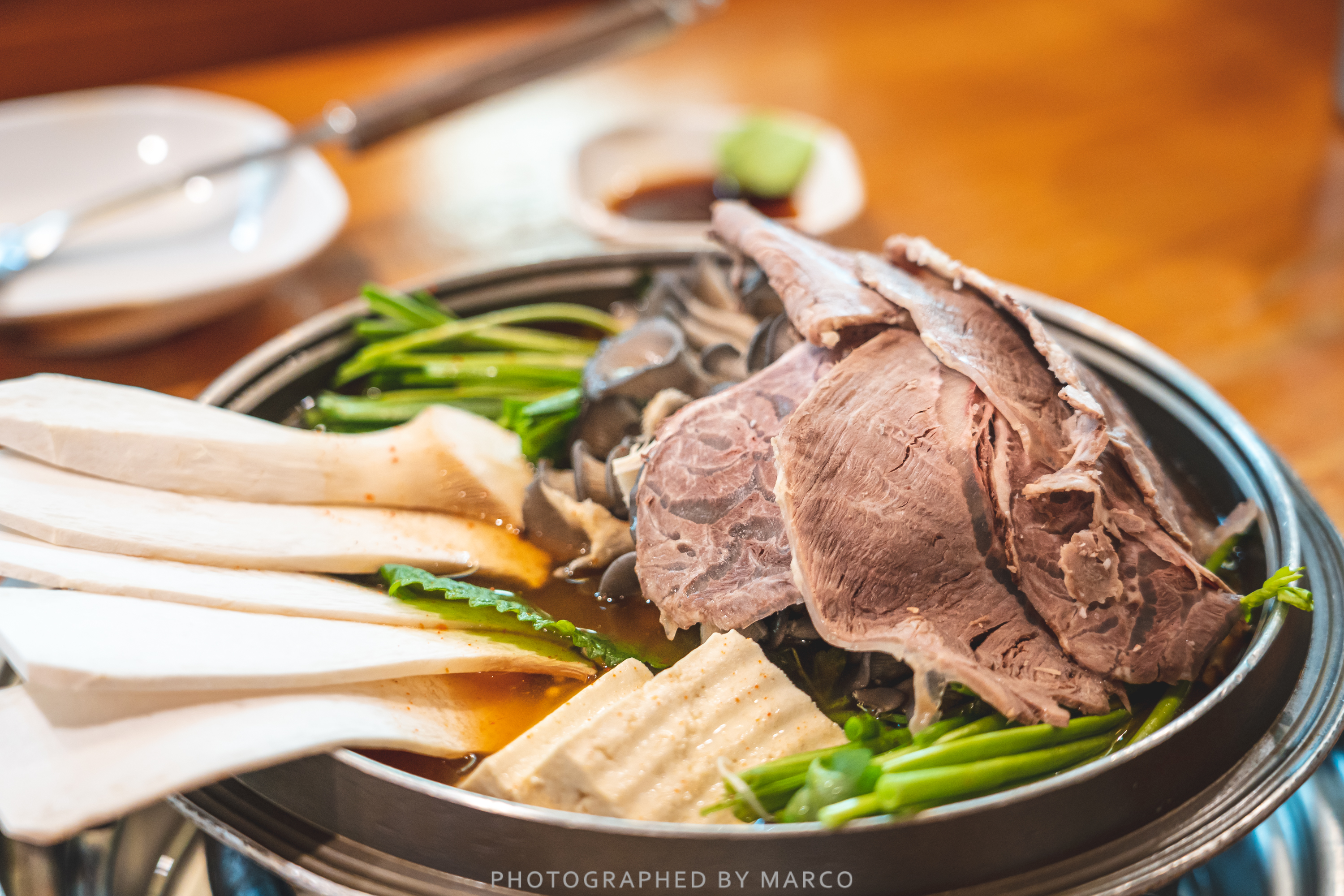 먼저 고기, 버섯, 미나리, 두부 등을 먼저 건져서 와사비 간장에 찍어 냠냠