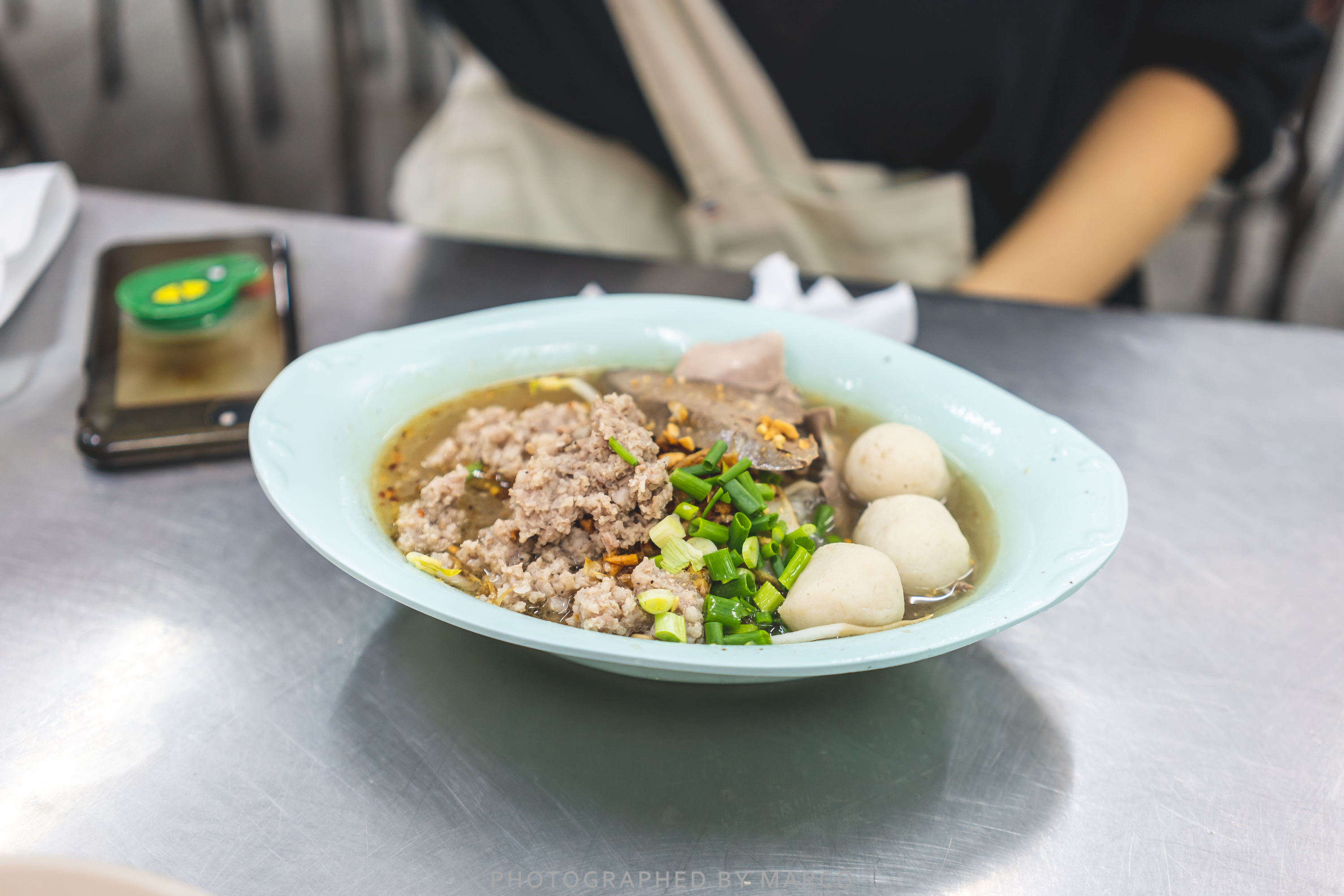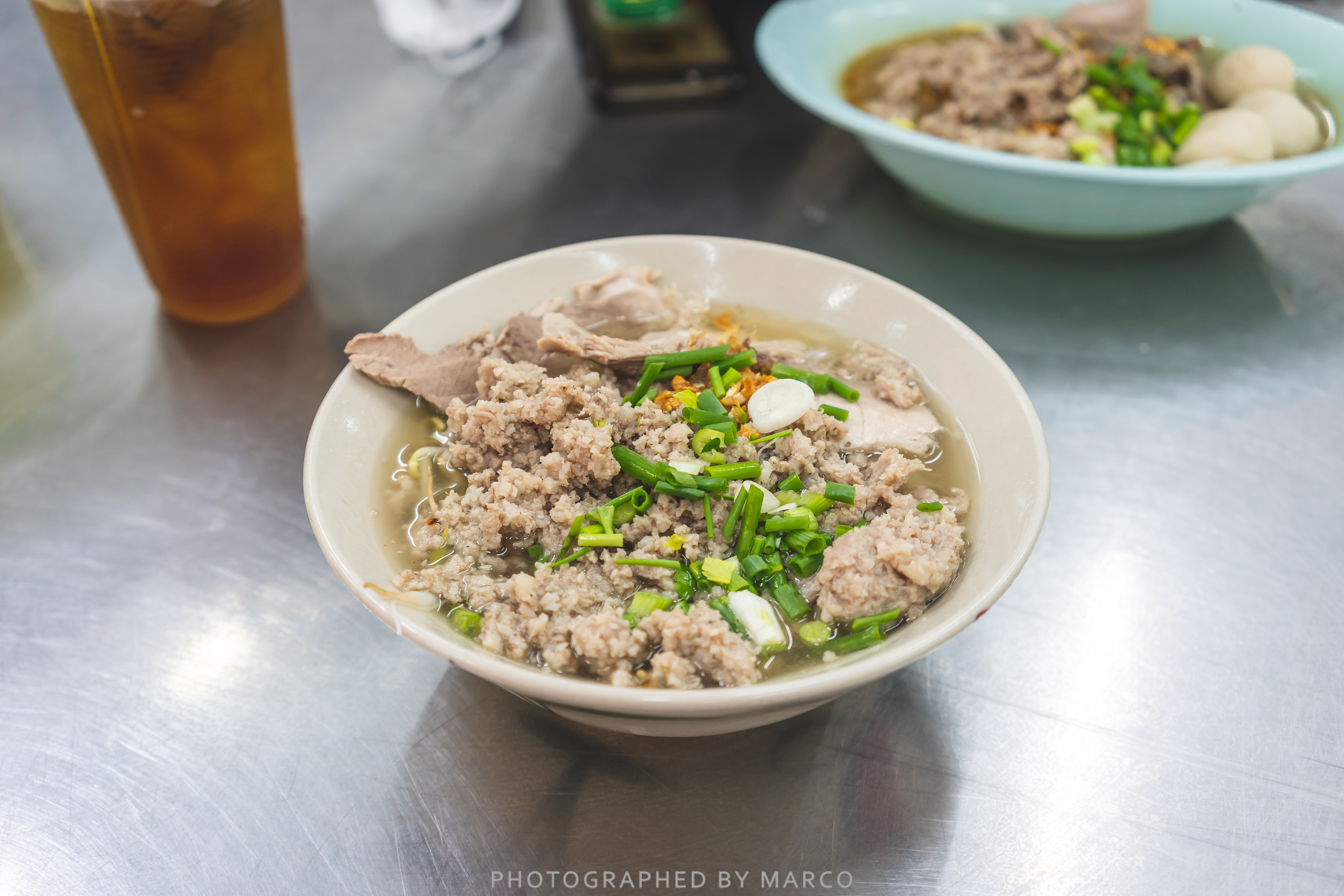 내가 주문한 물국수(PORK NOODLE) 라지 사이즈 (70밧),면은 가는 면, 토핑은 돼지편육만 추가했다.
