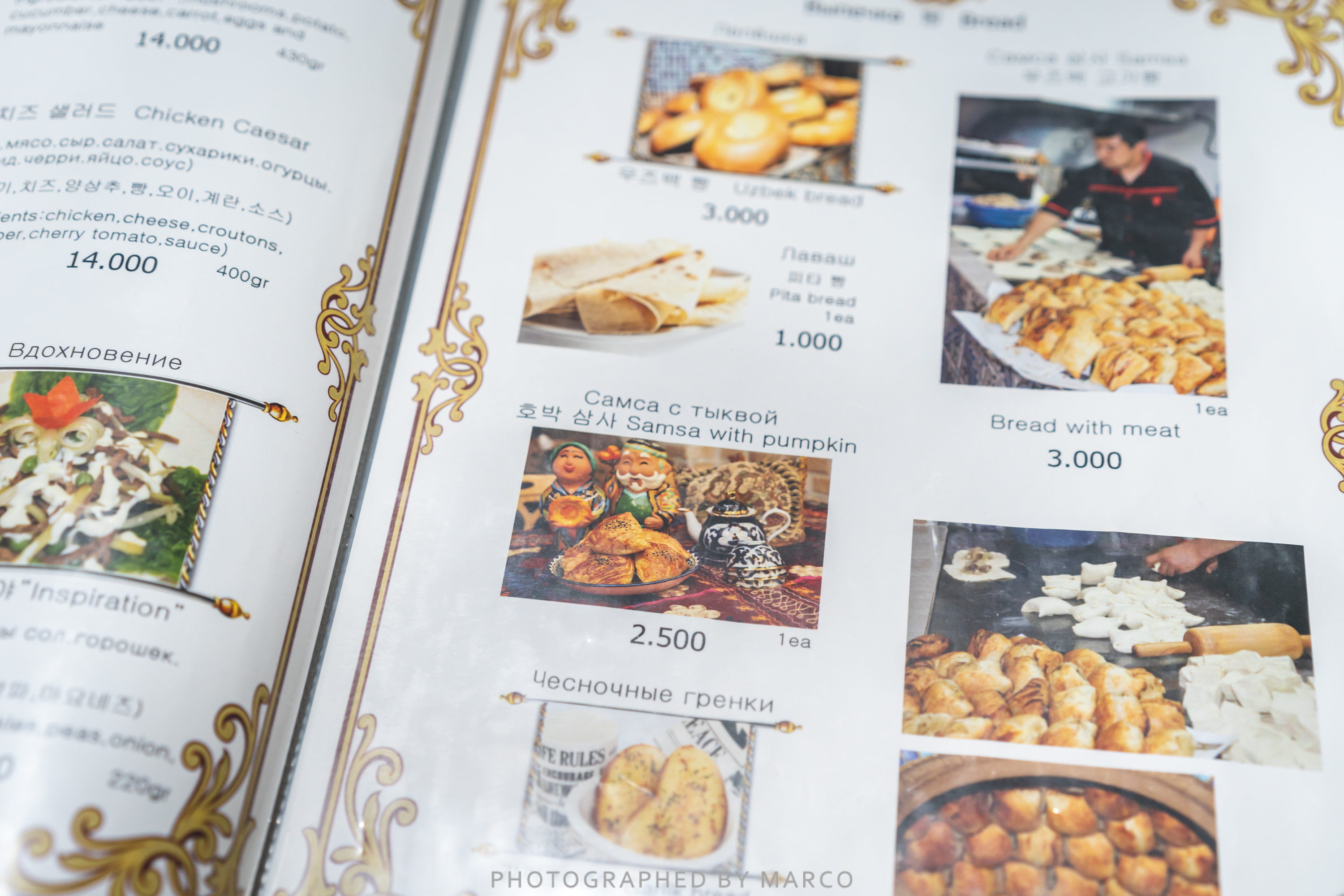 수프부터 꼬치까지 다양한 러시아,우즈벡 요리들이 담긴 메뉴판