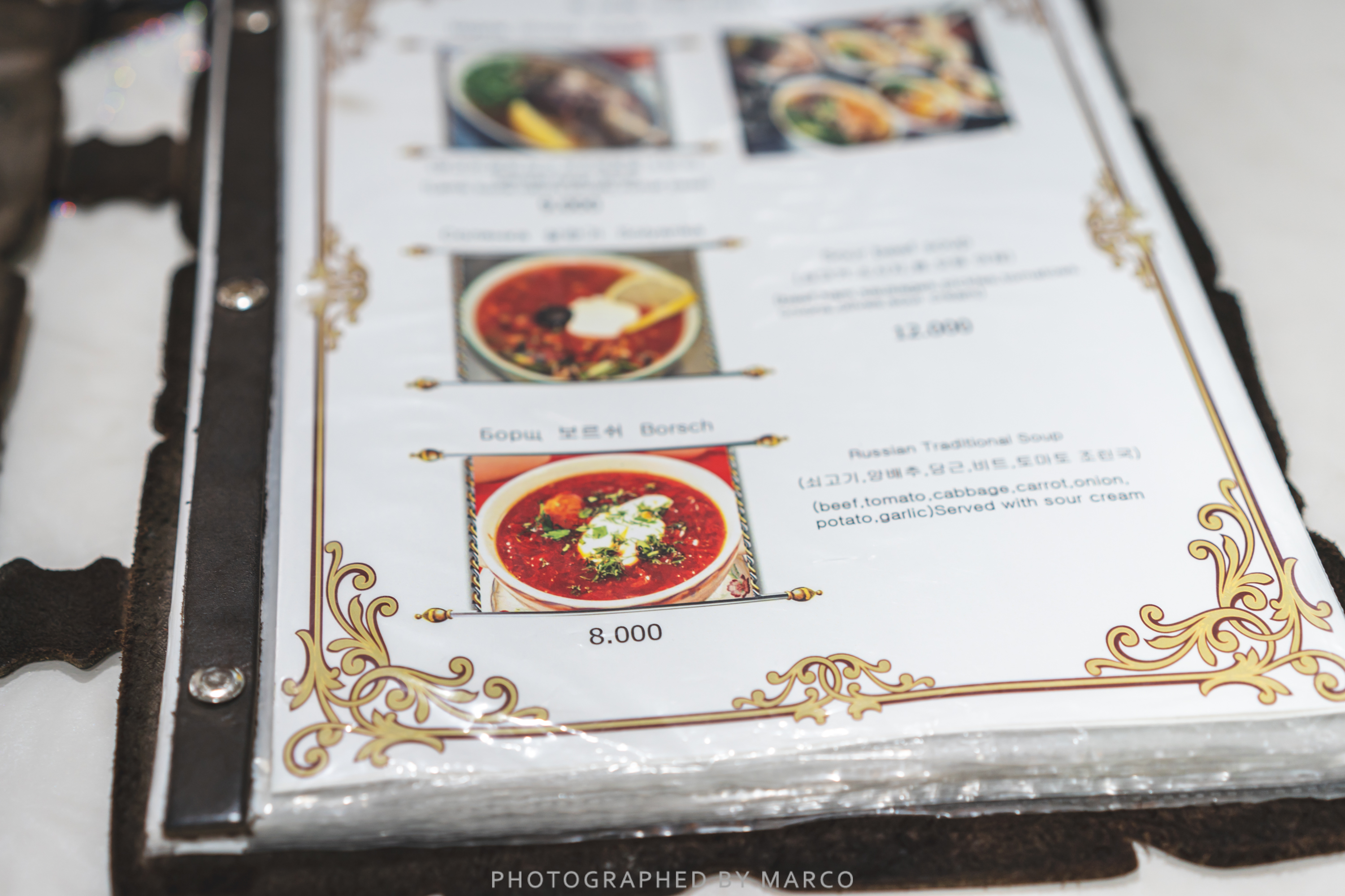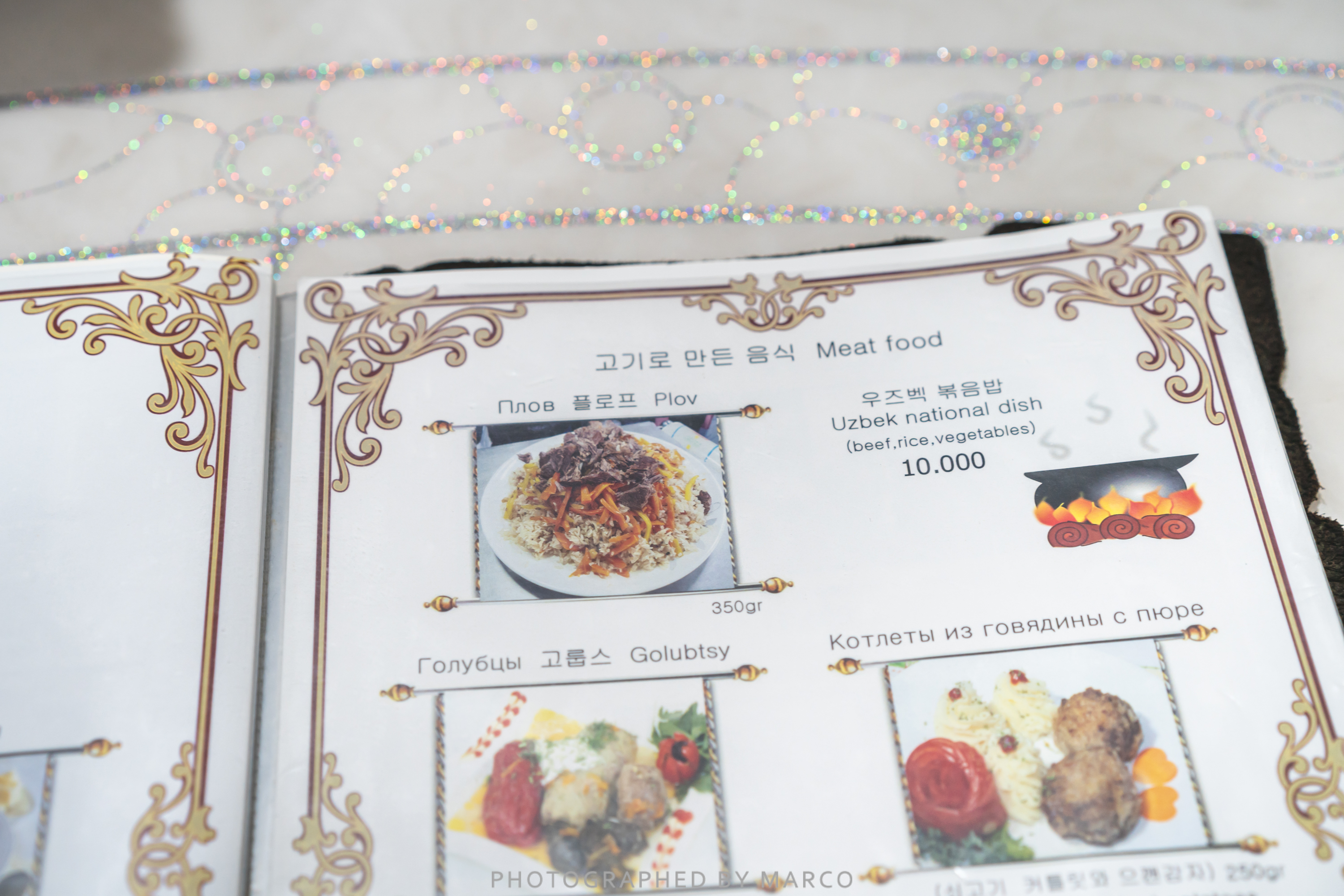 수프부터 꼬치까지 다양한 러시아,우즈벡 요리들이 담긴 메뉴판