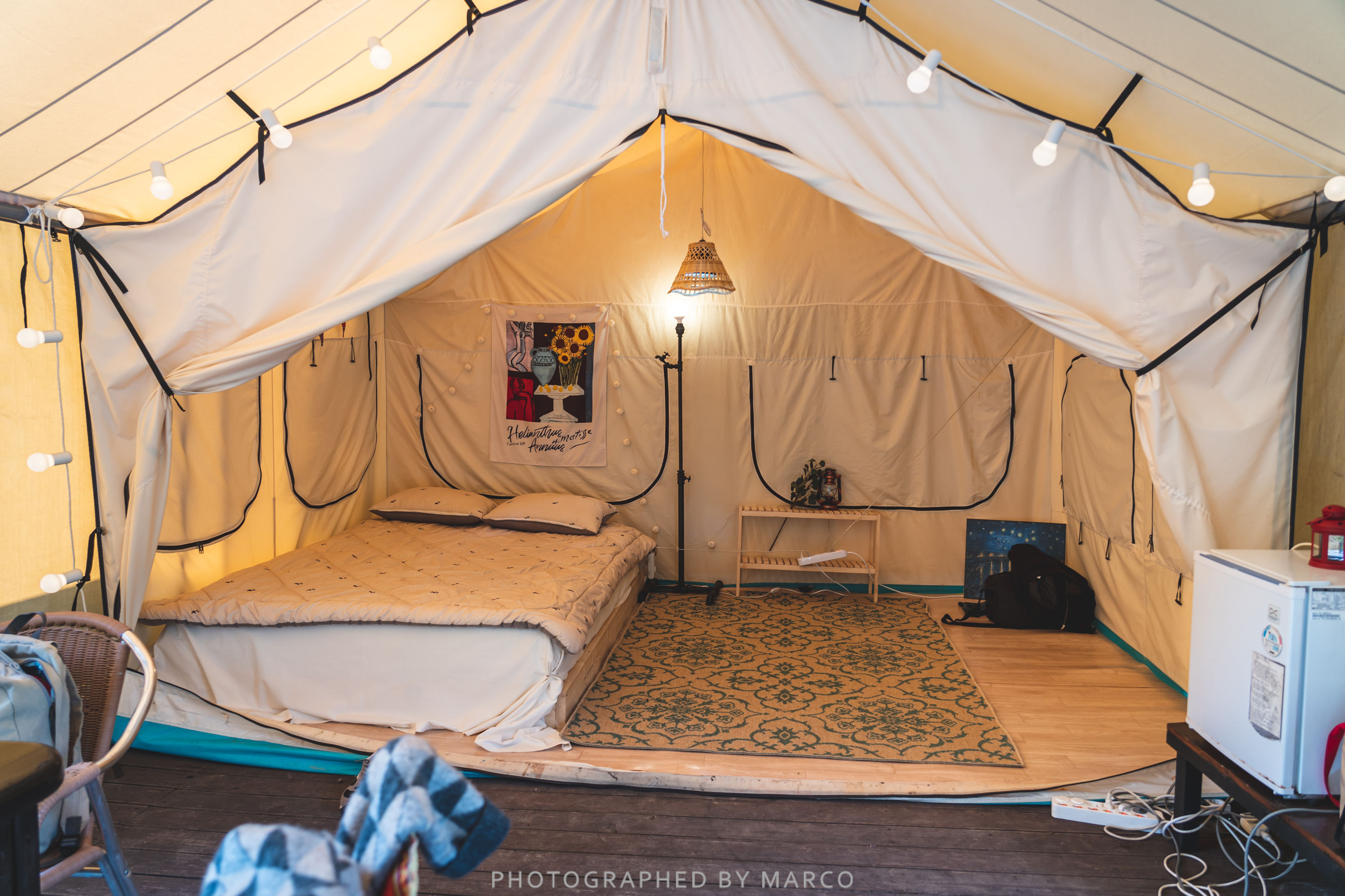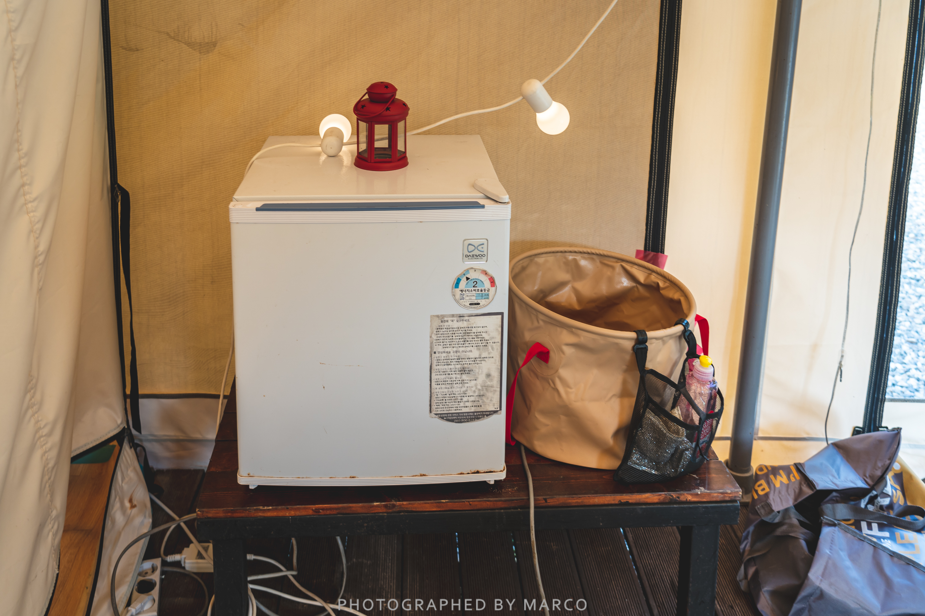 가평 오렌지 글램핑 텐트는 침대, 조명, 캠핑 테이블, 의자, 식기, 냉장고 등 기본적인 시설이 잘 갖춰져 있다.
