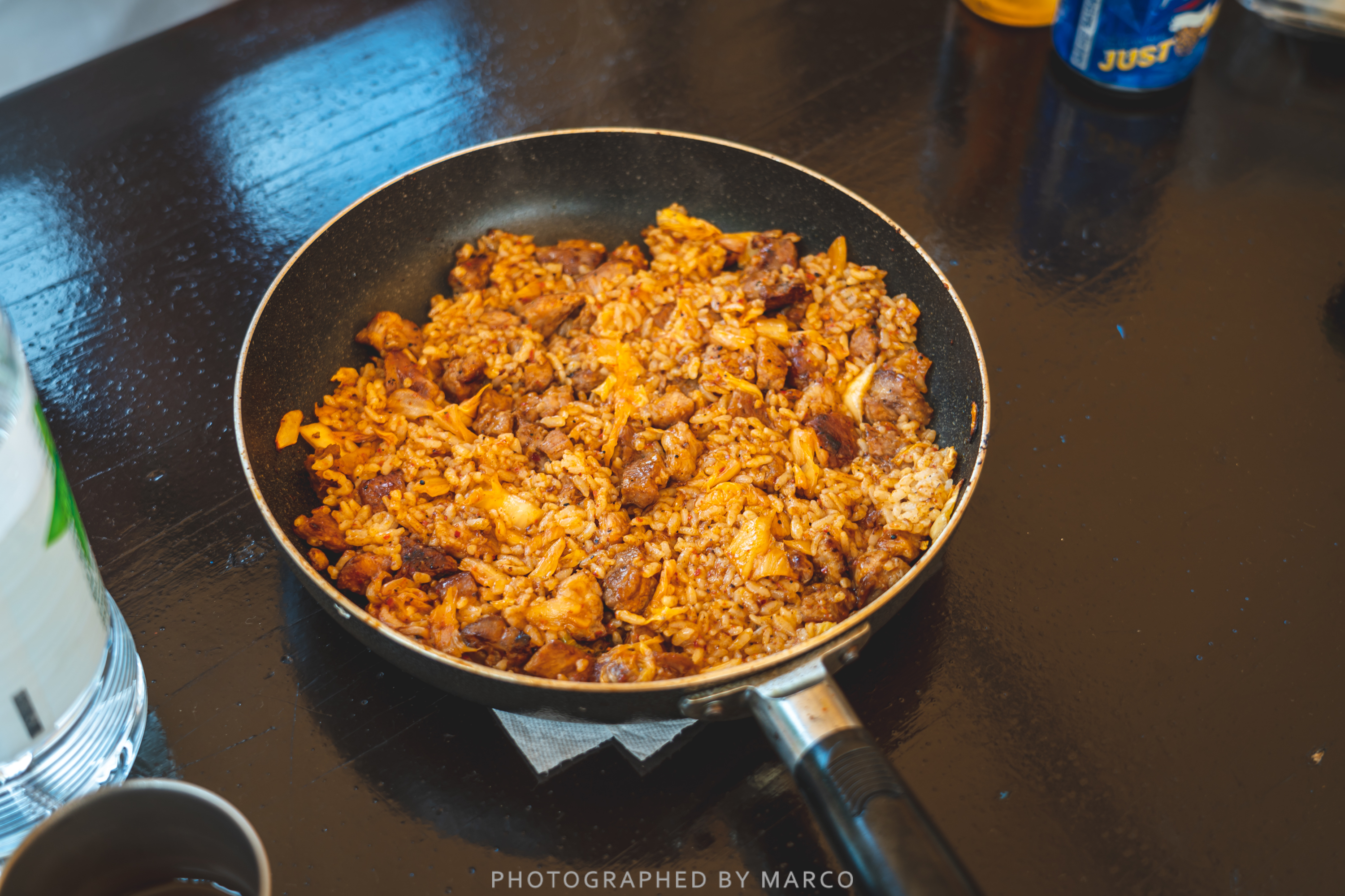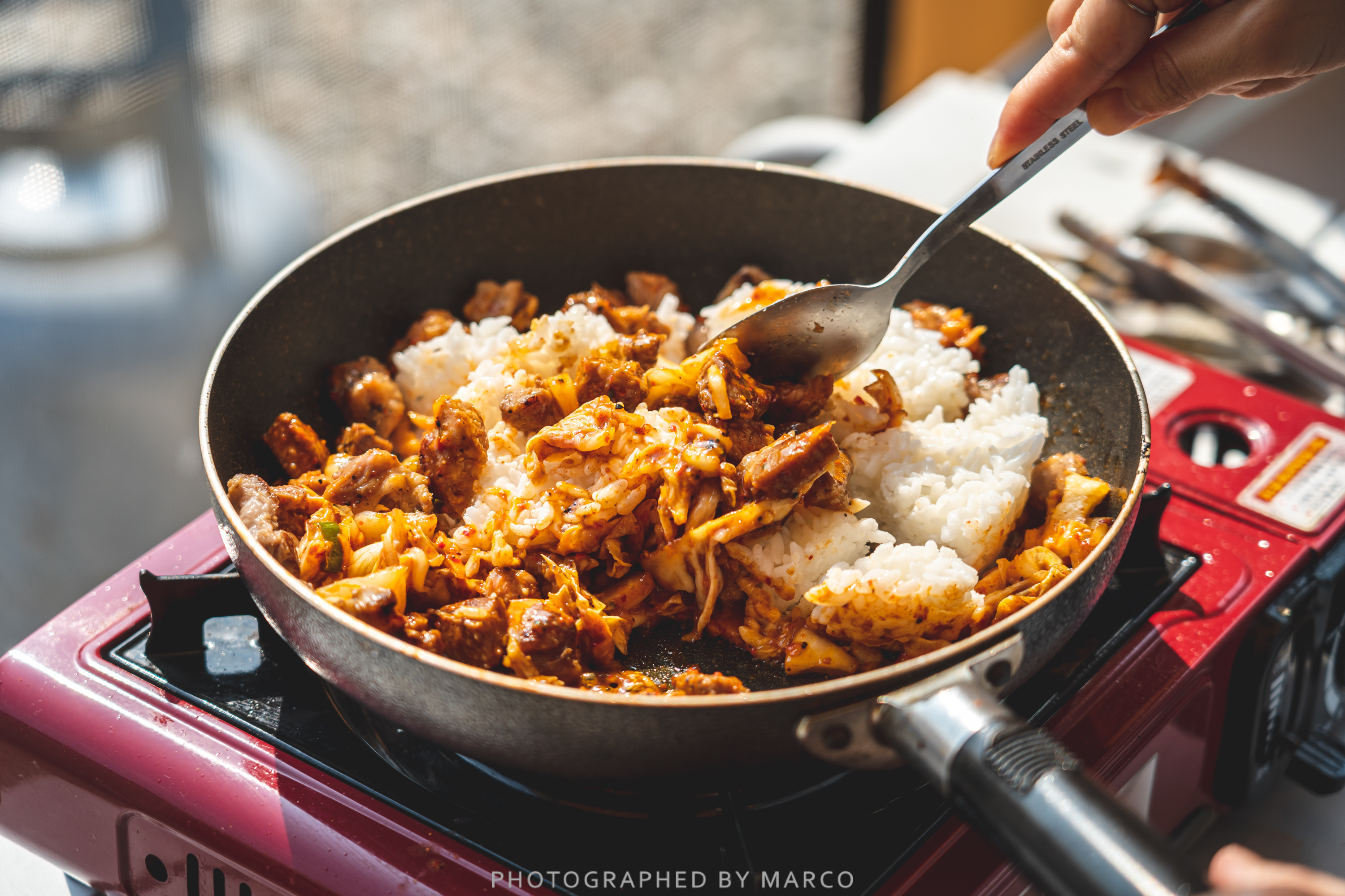 남은 목살과 햇반, 김치 등을 이용해 아침식사 준비