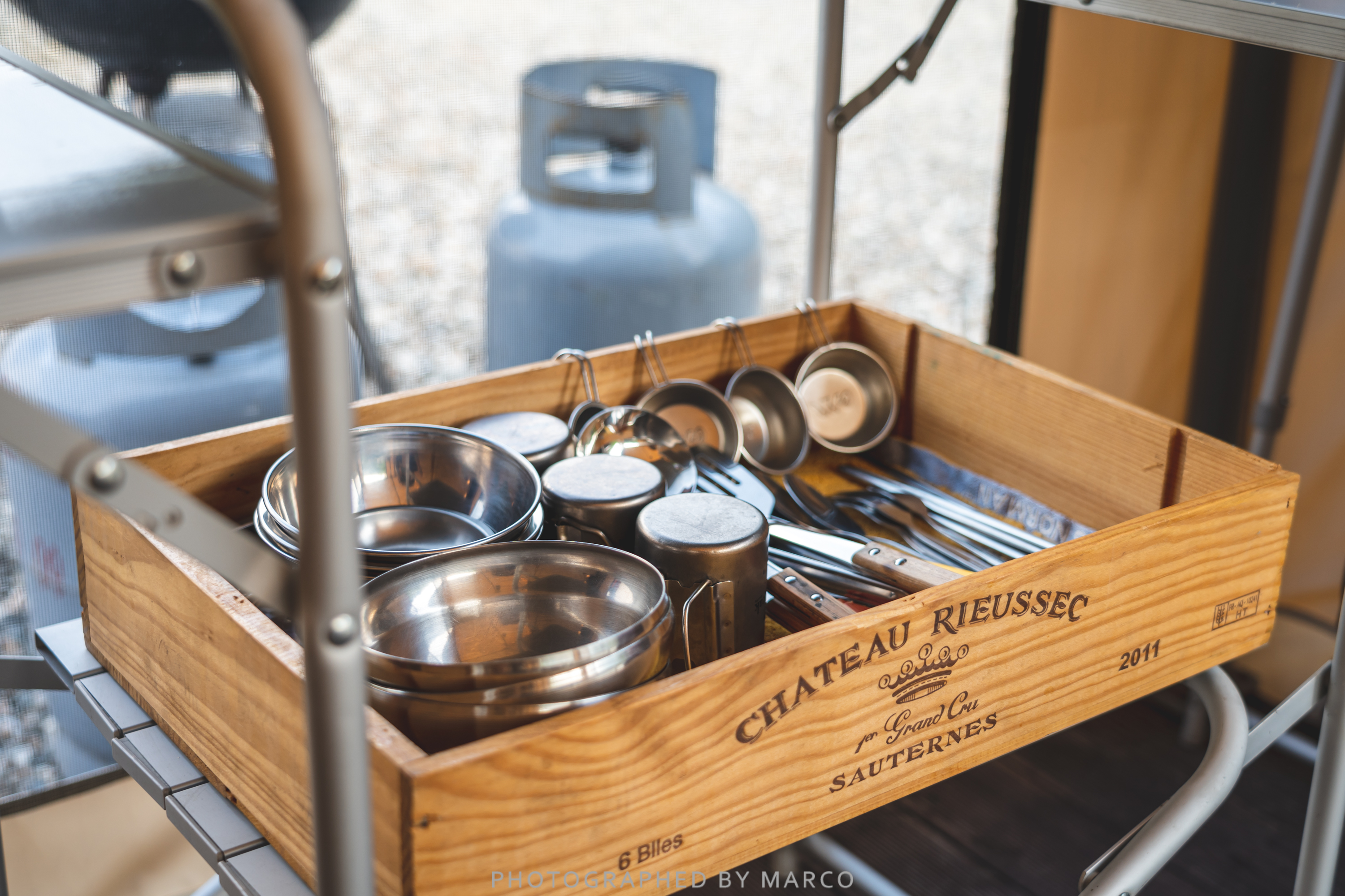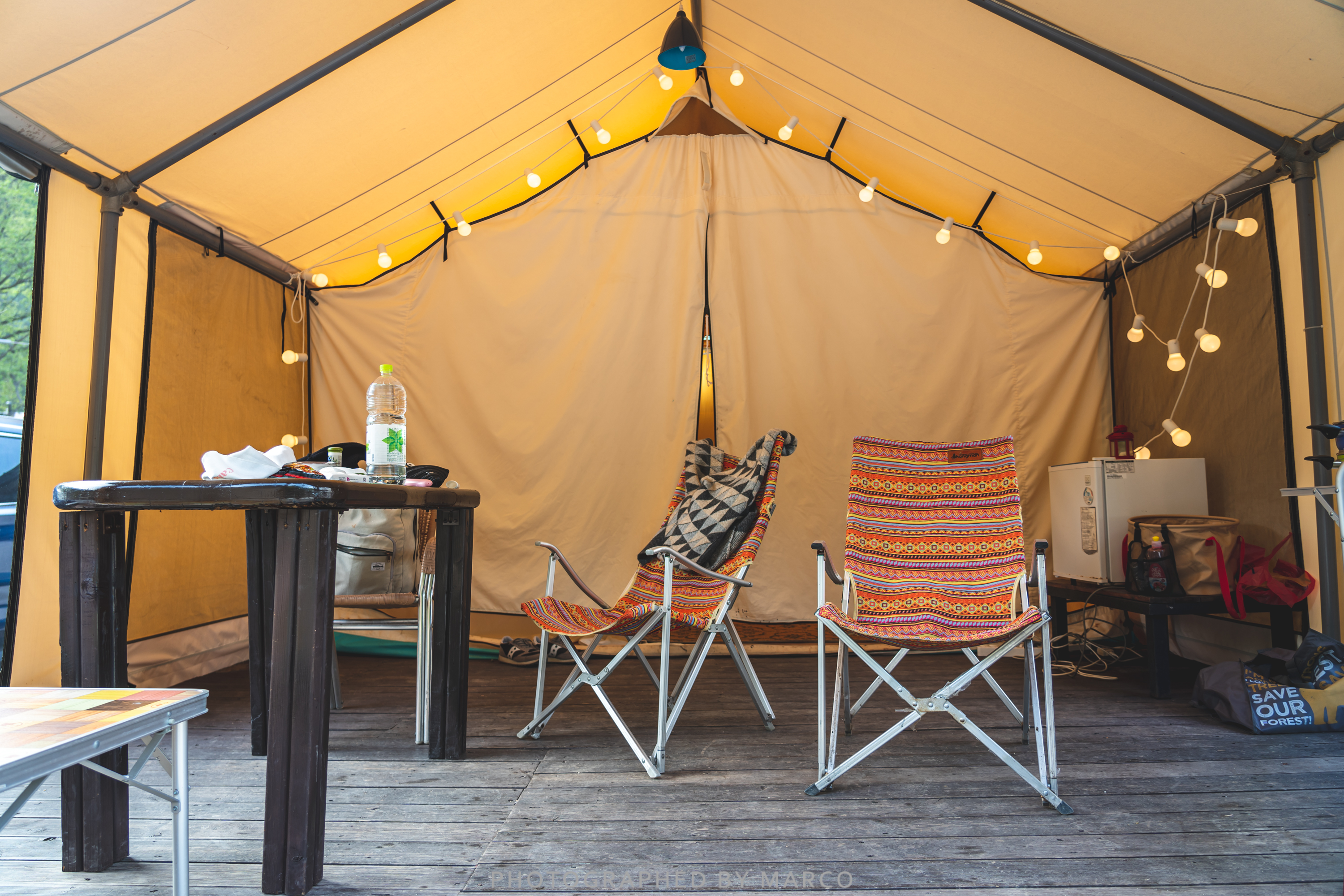 가평 오렌지 글램핑 텐트는 침대, 조명, 캠핑 테이블, 의자, 식기, 냉장고 등 기본적인 시설이 잘 갖춰져 있다.
