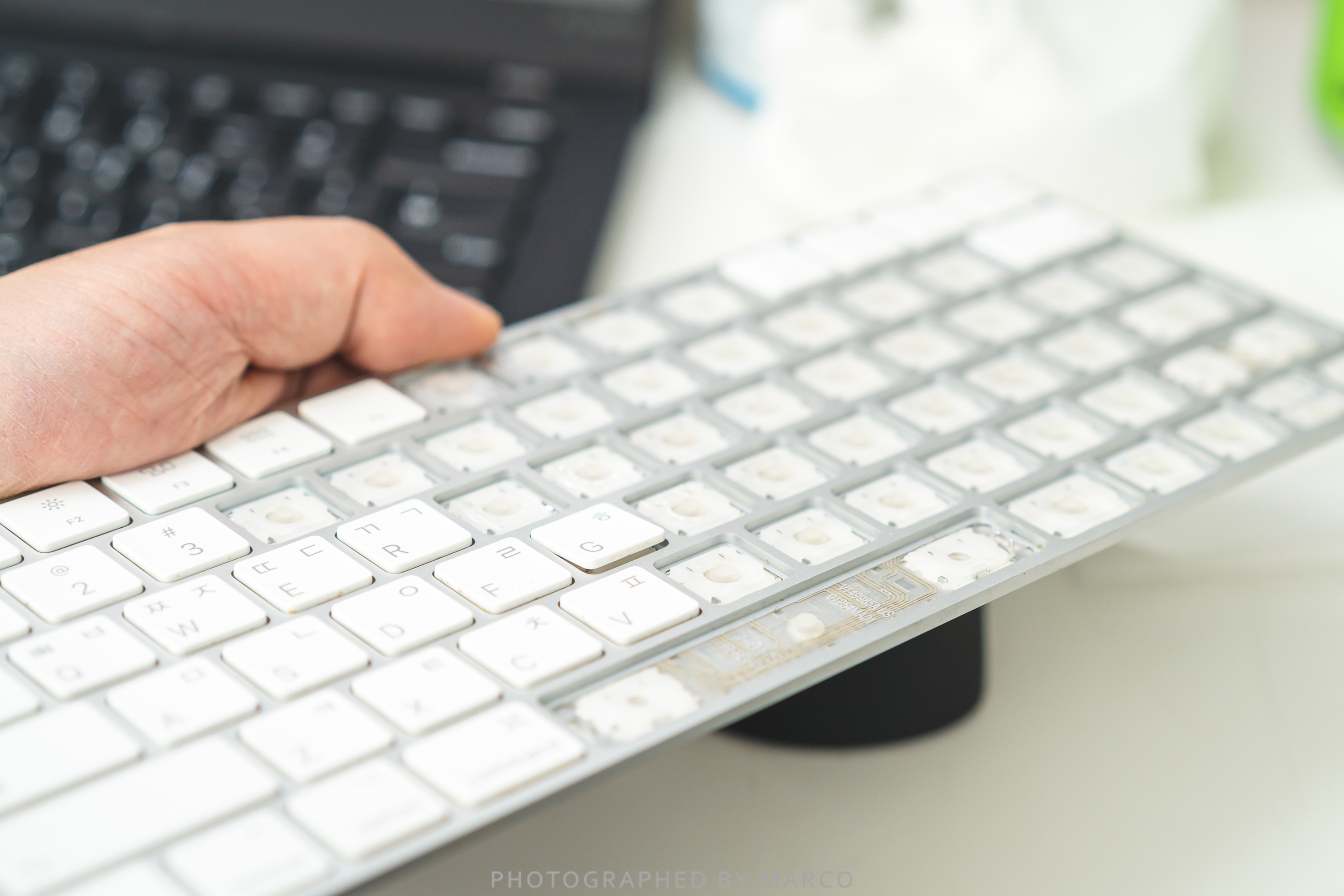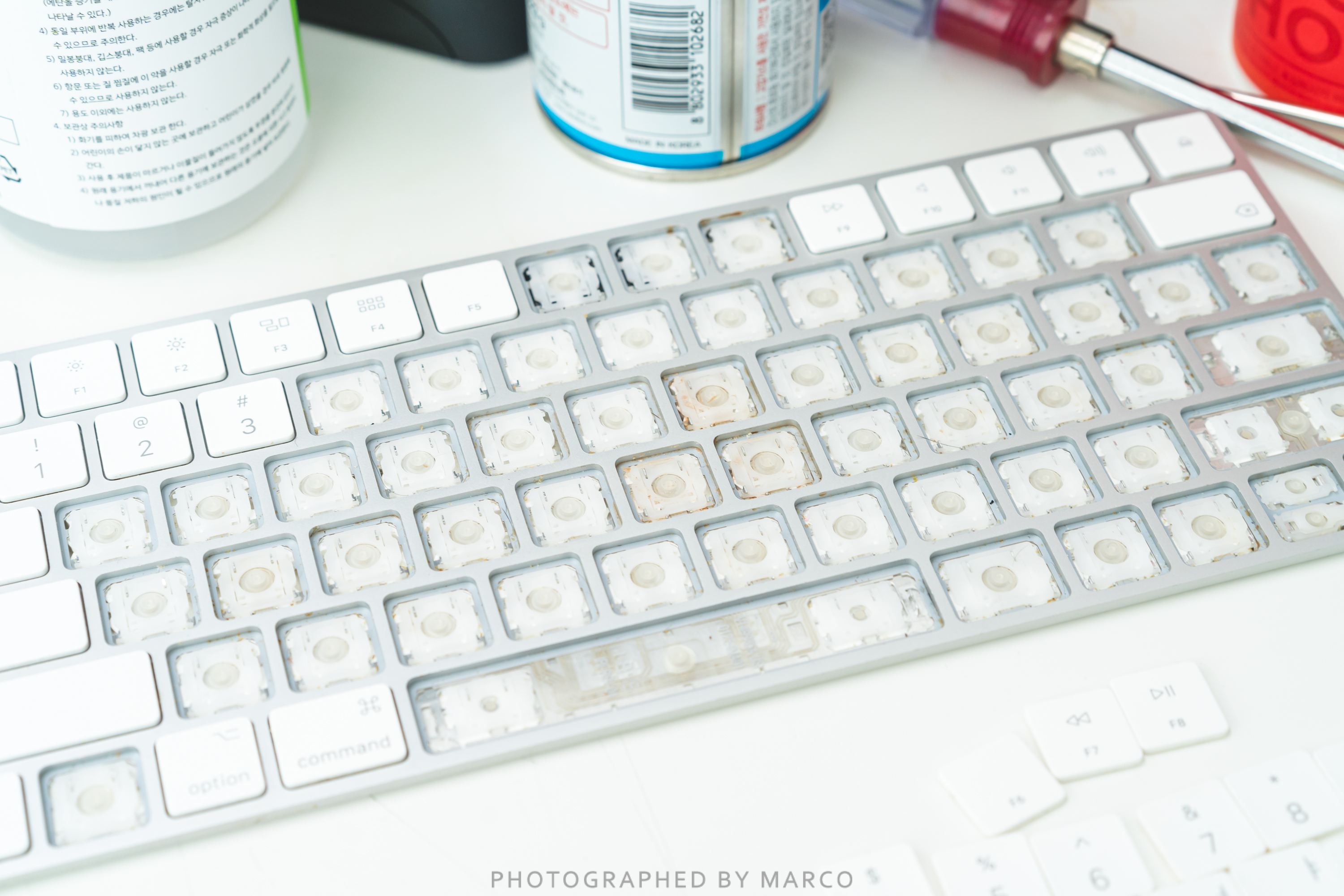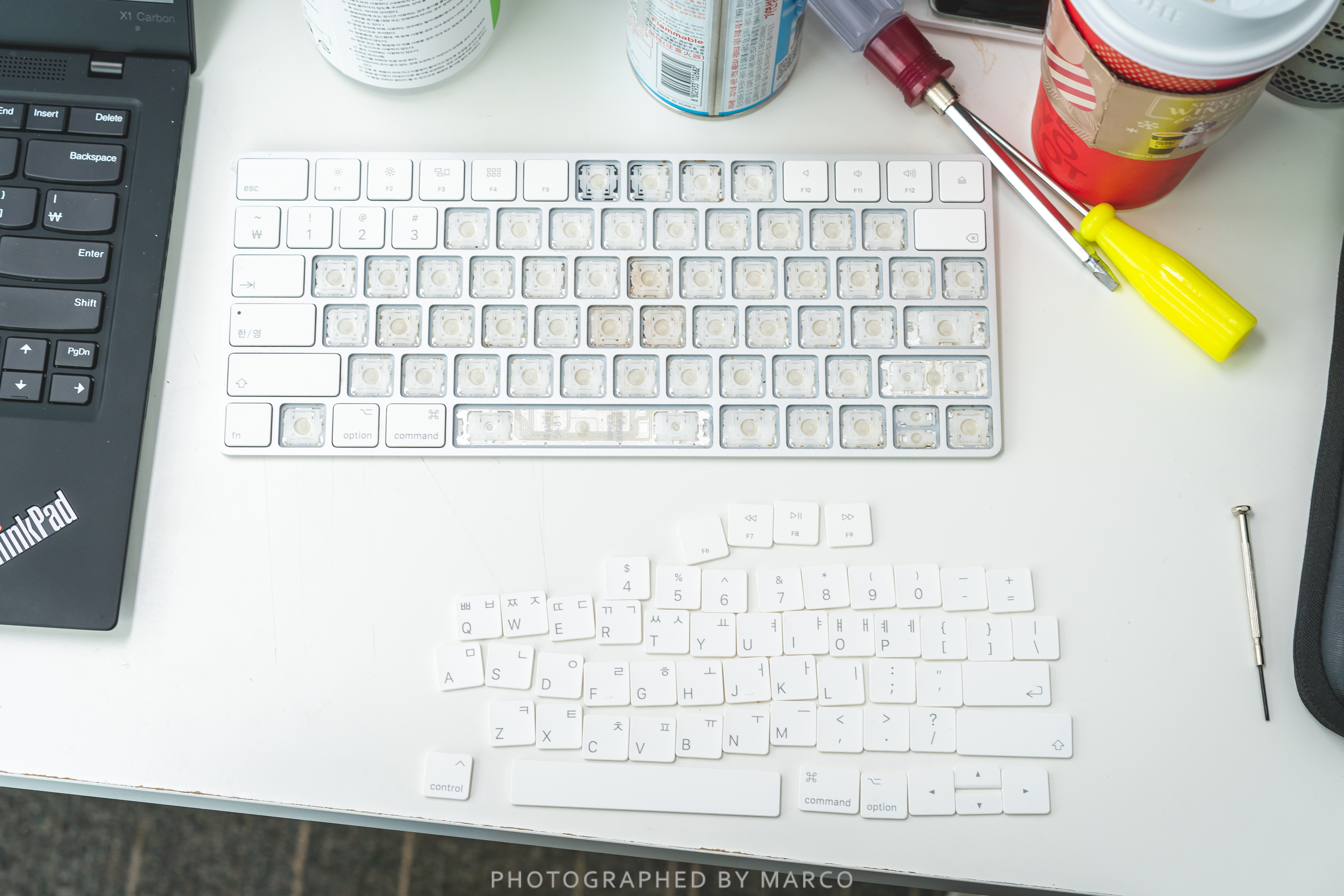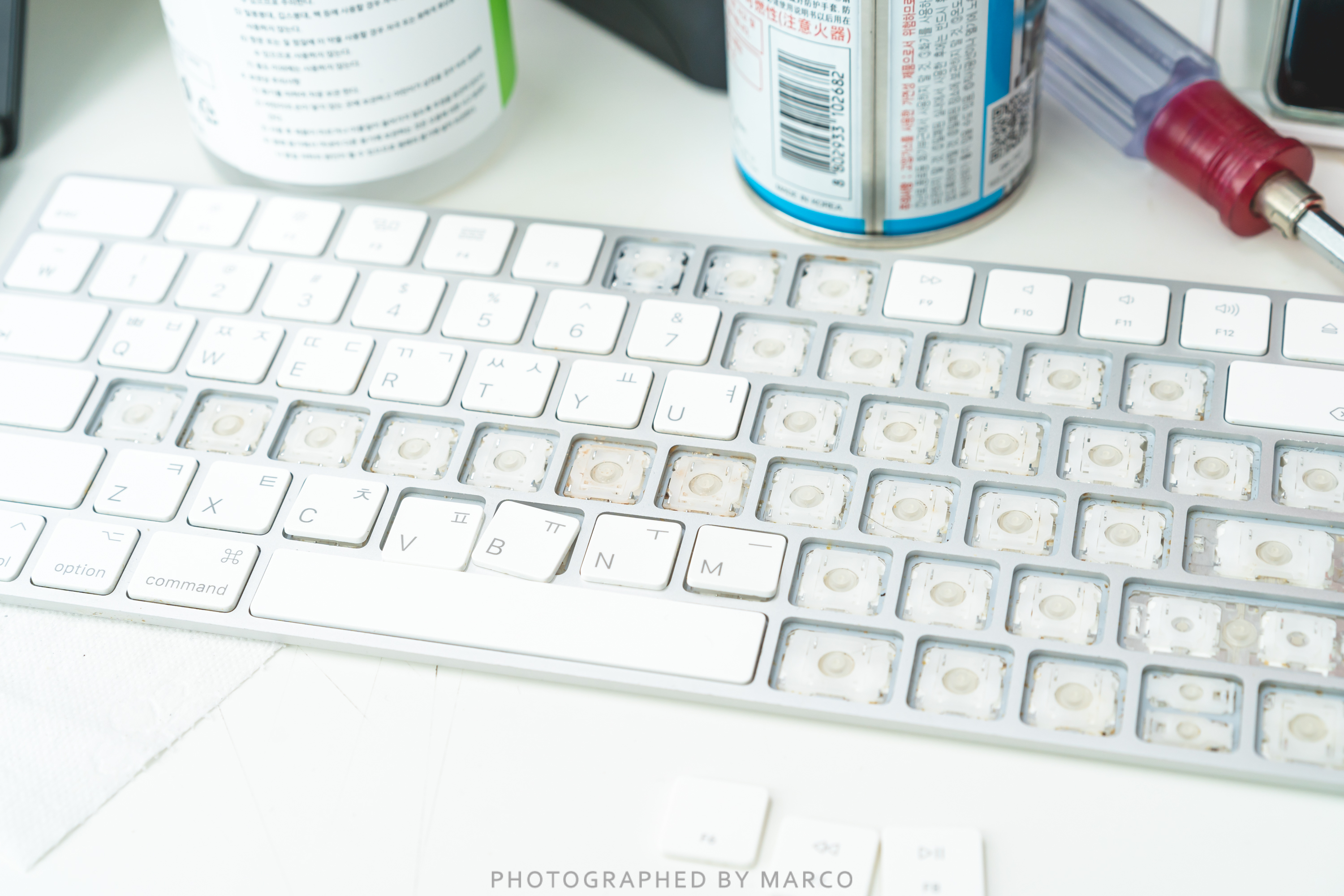 키캡 사이사이에 당분이 굳어서 키보드가 작동을 잘 안하게 되는 현상이 발생했다. 대화컴퓨터 애플 수리센터에 가니 키보드 수리는 안되고 교체만 되는데 비용이 무려 11만 원! 에라이 이럴 바엔 하나 새 거 사는 게 낫겠다. 싶었지만..