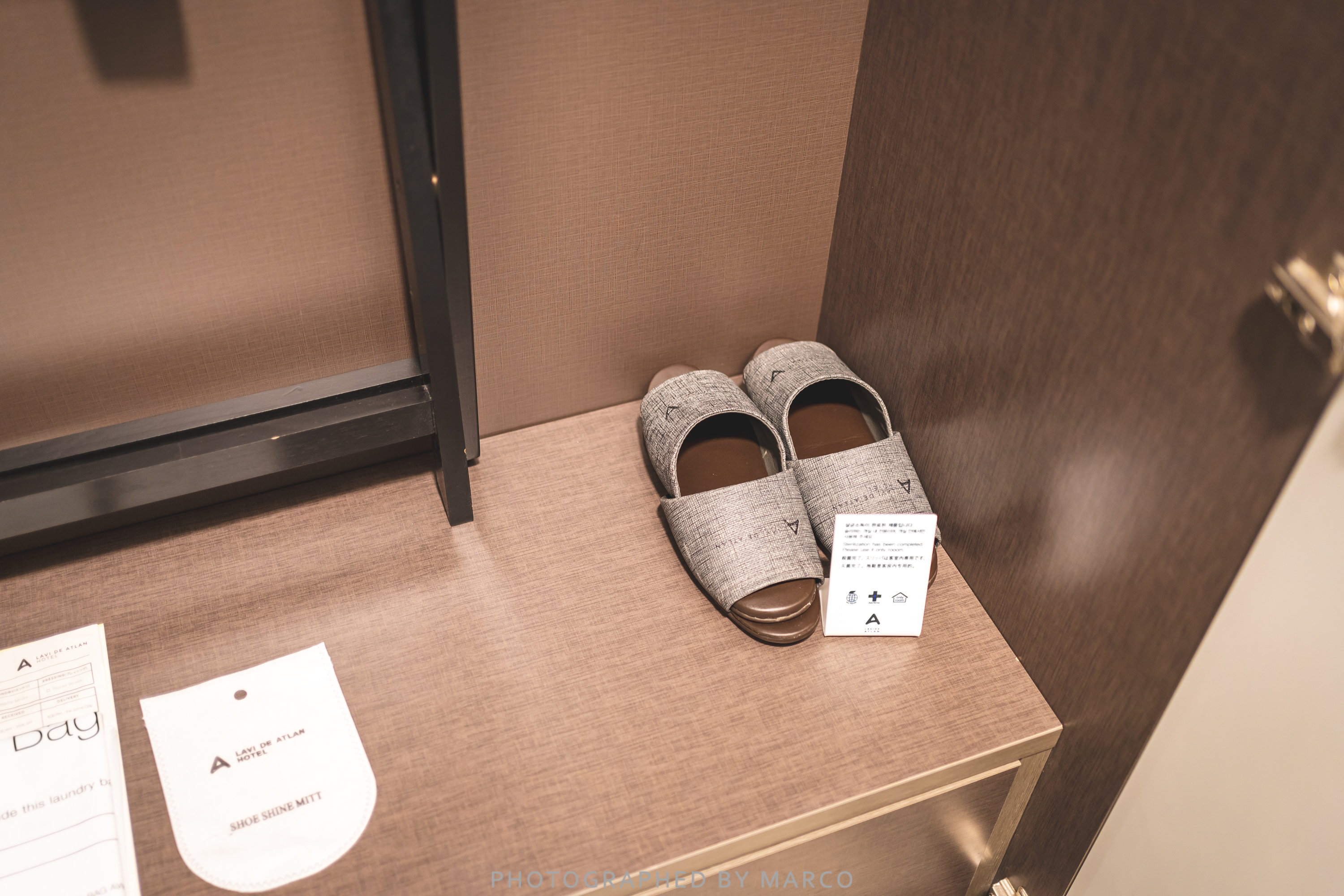 입구 옆 옷장에는 슬리퍼와 캐리어 거치대, 옷걸이 등이 비치되어 있다.