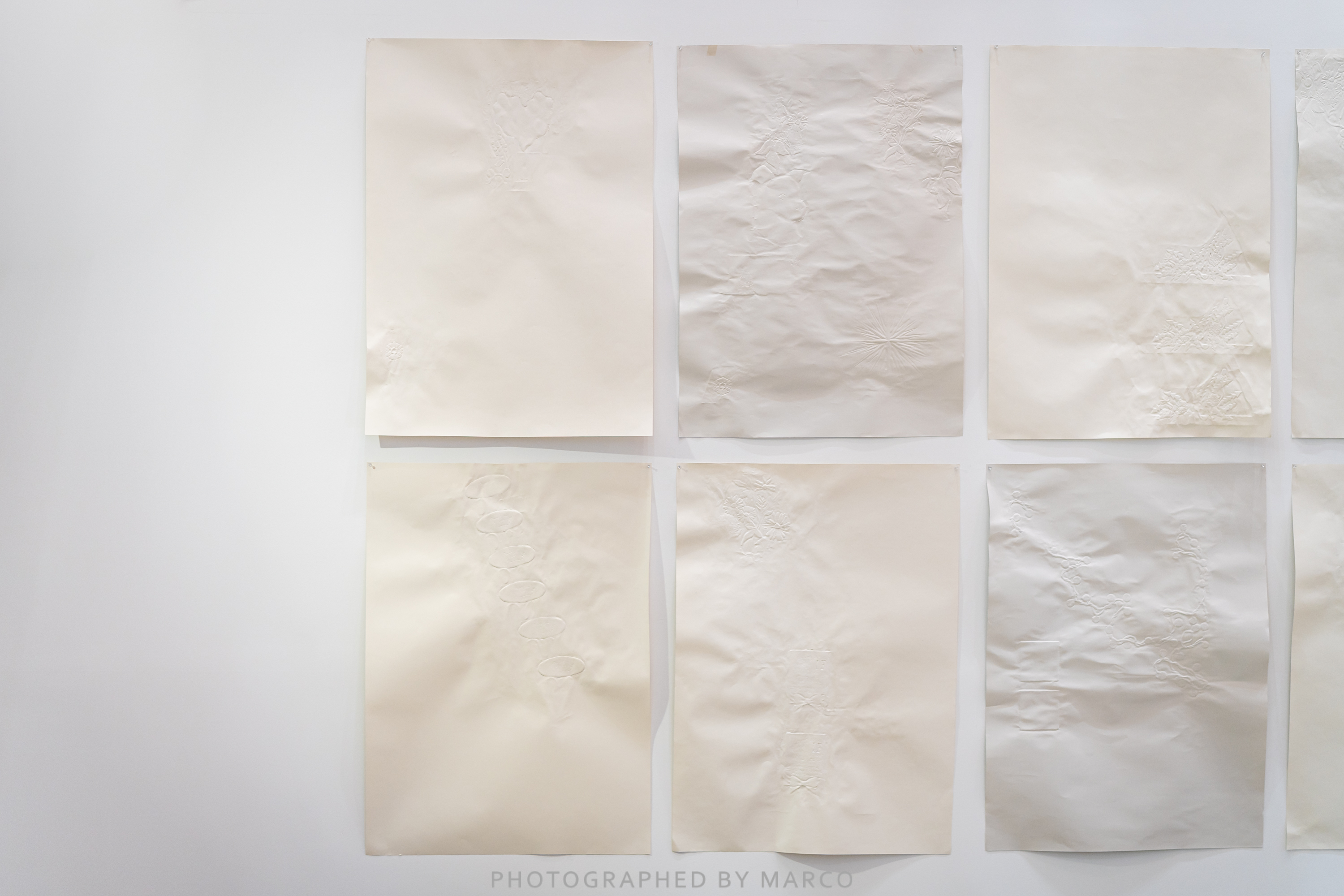 이유성은 회화를 전공했지만, 조각으로 포괄할 수 있는 오브제 형식과 물질 탐구를 진행해 왔다. 이번 전시에서 이유성은 〈테스팅: 액자와 야생꽃 묶음, 무화과와 과도, 고양이 그림과 랩탑, 복, 꼬마전구 장식, 핼러윈스노볼, 바람개비, 헵워스의 ‘Figure’에 이입하는 개, 겹쳐진 세 하트, 블루베리 포도 딸기를 집게발로 잡는 꽃게의 표면을 오래 바라봄〉(2018)과 함께, 신작 〈O.O.J(Out of Joint)〉(2020), 〈터널〉(2020), 〈엘바키얀의 가루〉(2020)를 선보인다. 이 작업들은 개념적으로나 물리적인 생성 과정에 있어서 각기 다른 속도를 가진 작업들이지만 작가는 전시장 안에서 하나의 군으로 구성하였으며, 사각형 혹은 육면체의 외곽선이 갖는 한계를 소프트웨어적으로 열어젖히고자 하였다. 먼저 〈테스팅〉은 TV의 액정 전면을 양각한 목재 프레임으로 뒤덮은 작품이다. 프레임에 뚫려 있는 구멍들 사이로 디지털 이미지가 화면보호기처럼 반복해서 지나간다. 이 디지털 이미지를 화면보호기처럼 덮고 있는 것은 제목에 명기되어 있는 형상의 표면들로, 작가는 이 표면을 ‘오래 바라봄’이라고 국문 제목을 통해 지시하며, 조각적 요소와 디지털 이미지의 연결부, 그리고 그 속도감을 테스팅 한다. 신작들은 셰익스피어의 햄릿에 나오는 대사이자 필립 K. 딕의 소설 제목으로도 사용된 표현인 ‘time out of joint’로부터 출발했다. 〈O.O.J〉는 양각한 목재 부조작업을 젖은 종이로 캐스팅한 작업이다. 이유성에게 종이라는 질료는 간단한 에너지만으로도 2, 3차원이 될 수 있고, 차원이 혼재될 수도 있는 유연하고 무른 재료이다. 작가는 이전에 자신이 새겼던 상들의 연결부를 깨트려 종이에 캐스팅했고, 결과적으로는 이 과정에서 자연스럽게 형성된 주름이나 구김이 만들어내는 여백에 주목한다. 〈터널〉은 반복을 통해 무한하게 이미지를 확장시킬 수 있다는 점에서 관심을 가져온 ‘패턴’을 활용한 작업이다. 도일리 페이퍼로 패턴을 만들고 그 안에 작은 형상들을 변칙적으로 구성하여 관람객과의 물리적 거리를 조정한다. 〈엘바키얀의 가루〉는 출품작들 중 유일하게 조각의 수직적 속성을 드러낸다. 작품의 국문 제목은 지식 공유를 주장하며 몰래 빼낸 유료 논문을 무료로 제공해온 사이트(Sci-Hub)의 운영자 알렉산드라 엘바키얀의 이름에서 따온 것이다. 지식 해적질로도 불리는 엘바키얀의 행위는 ‘Shatter scatter’라는 영문 제목처럼 지식에 대한 권리를 ‘산산이 박살내서 흩뿌리는’ 행위일지 모른다. 그런데 박살내고 흩뿌리는 행위는 조각에서 질료가 변형, 변성되게 만드는 물리적 행위이기도 하다. 이유성은 다양한 재료를 일상적, 반복적으로 다루면서 조각의 매커니즘, 물성, 형태 및 구조, 동세 등에 대하여 탐구하고 있으며, 특히 재료의 물리적 속성을 여과해내지 않고 그 자체를 내러티브로 드러낼 수 있는 오브제에 몰두하고 있다.