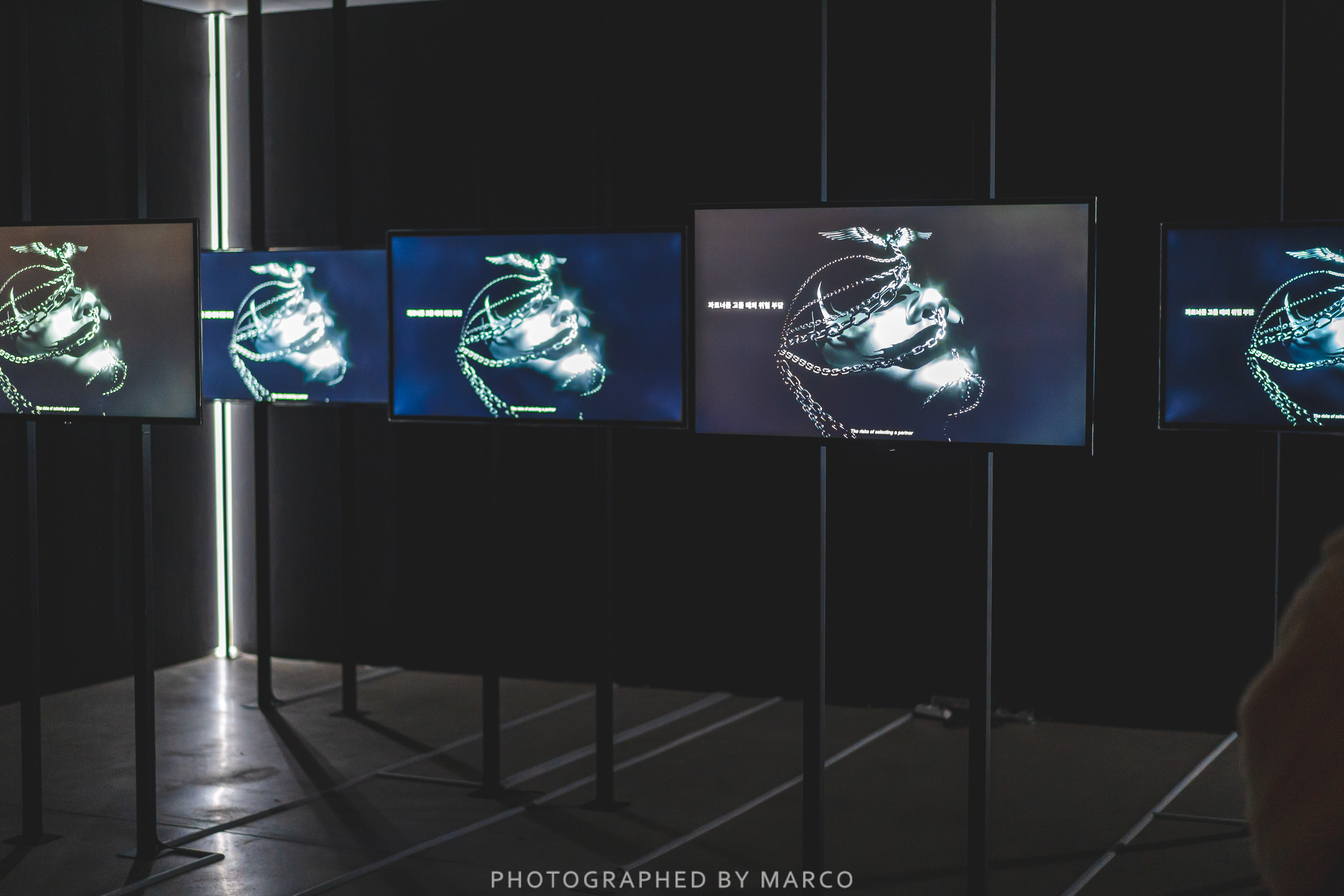 업체eobchae는 구성원들이 지닌 관심사와 기술을 활용해 창의적인 작업을 도모하는 오디오-비주얼 프로덕션 그룹으로, 2016년에 김나희, 오천석, 황휘가 결성한 그룹이다.이들의 작업은 사변적 장치, 즉 대체 가능한 미래 또는 가능세계에 대한 적극적인 사변(speculation)과 시뮬레이션을 거쳐 실재처럼 느껴질 정도로까지 밀어붙인 허구를 탄생시키고자 한다. 이것은 인종, 계급, 젠더적 마이너리티에게는 또 다른 현재와 미래를 꿈꾸게 하는 가능성의 도구이자 미학적 방법론이 될 수 있다. 이번 전시에 소개되는 〈결정사 시퀀스〉(2020)와 〈결정사의 노래〉(2020)는 업체eobchae가 창안한 사변적 존재들인 결정사에 관한 작업이다. 업체eobchae는 자신들이 가능세계 A를 접촉해온다는 설정 하에 세계의 둠스데이 클락을 지연시켜 보고자 하는 야심을 지닌 지하조직인 결정사로 활동한다. 심각한 저출산 사회인 가능세계 A의 체제는 유성생식을 통한 개체 재생산을 종용하지만, 결정사들은 혼종생식을 위한 대디앱(daddy.app)을 창안한다. 또한 앱 배포, 광고 송출, 선동적 지하 집회 조직, 유통망의 포섭 같은 것들을 시도하고, 제련된 광고 텍스트, 매끈한 3D 무빙 이미지, 리추얼과 프로파간다가 혼합된 전자음악 퍼포먼스, 무료로 다운로드 가능한 AR 페이스 필터 등을 통해 소비자, 구독자를 유혹한다.