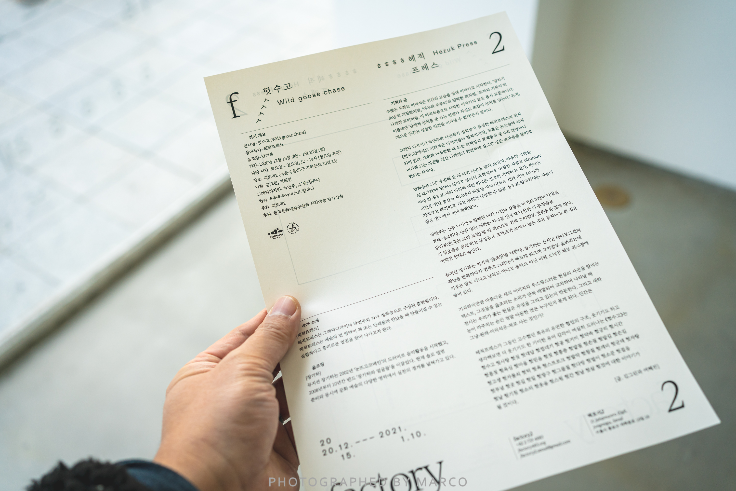 팩토리2는 2020년 마지막 기획전으로 헤적프레스의 전시 《 헛수고 》를 2020년 12월 15일부터 2021년 1월 10일까지 개최한다. 헤적프레스는 그래픽 디자이너 박연주와 사진작가 정희승으로 구성된 출판팀으로 박연주는 텍스트의 구조와 배열에 관심을 두고 있으며, 정희승은 사물과 인물, 신체, 공간의 물성을 포착하는 작업을 이어가고 있다.