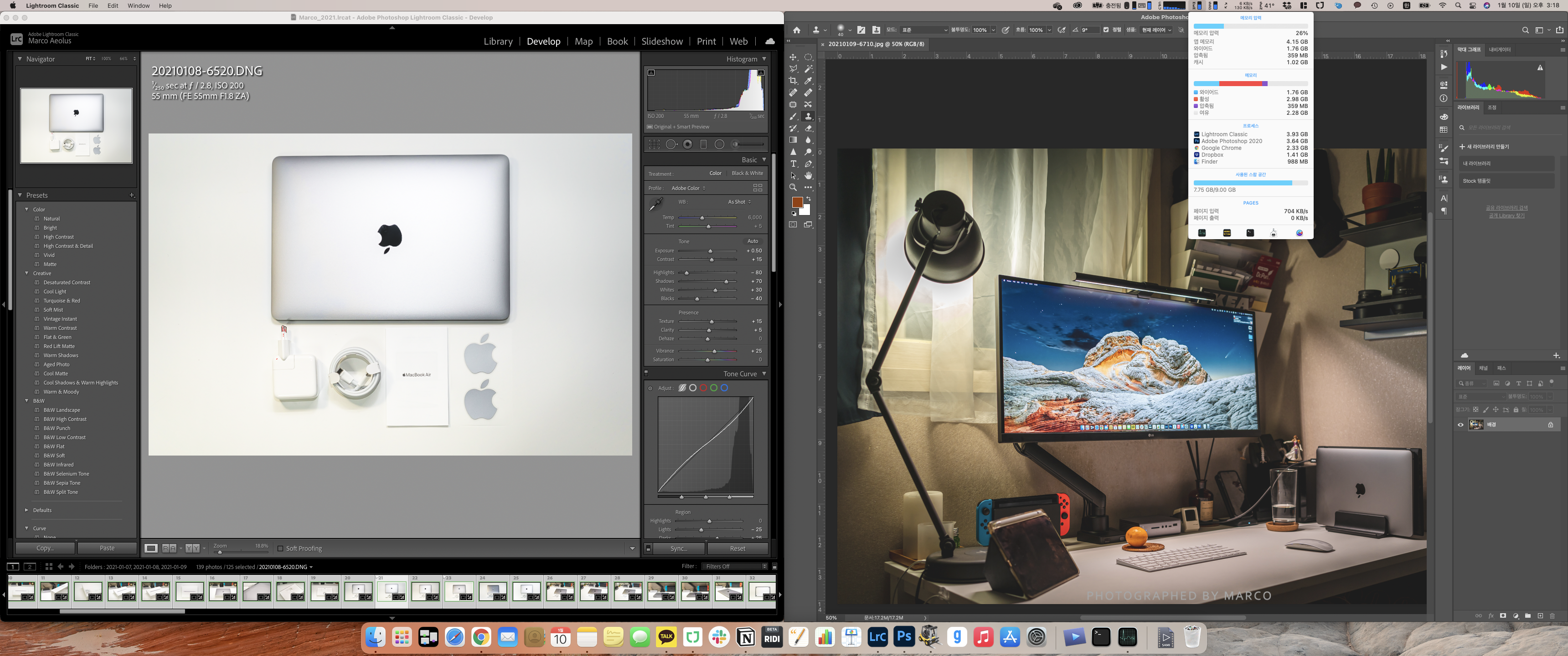 물론 수치적으로 부족하다고 해도 애플의 메모리 최적화 기술로 버벅거리는 상황이 많지는 않았지만 사진 임포트,익스포트, 편집시 등 라이트룸 클래식은 항상 8~12기가 정도의 램을 차지했다. 특히 200장 이상의 사진을 임포트,익스포트 할 때는 프로그램이 멈추거나 컴퓨터 전체가 버벅이는 현상이 빈번했다.. 물론 이 현상이 램 때문인지, 라이트룸 호환이 안되어서 인건지.. 혹은 팬리스라 열처리가 제대로 안되어 스로틀링이 심해져서 그러는 건지 잘은 모르겠지만 일단 기본적으로 물리적인 램 용량이 부족하다고 느꼈다..
