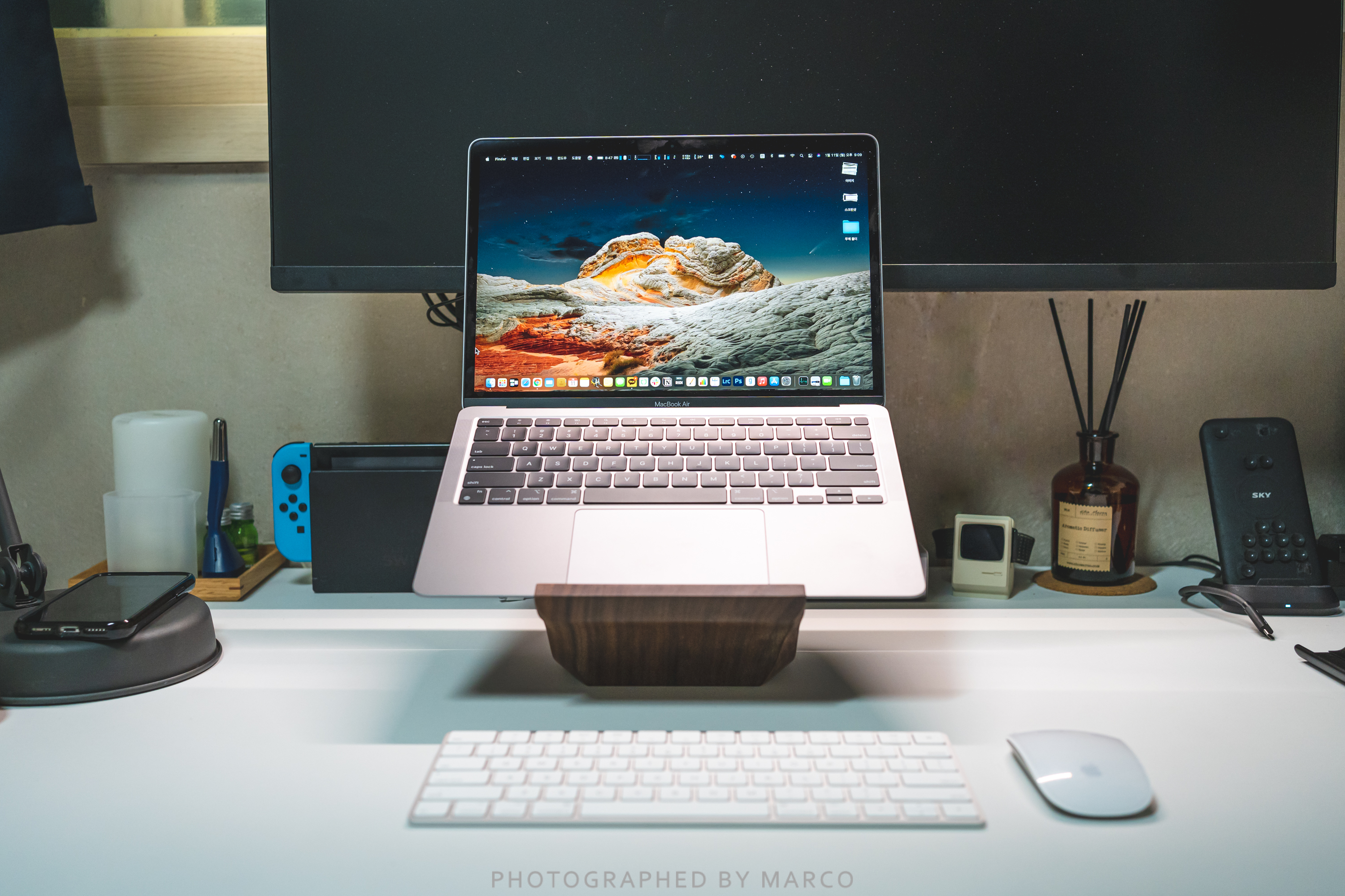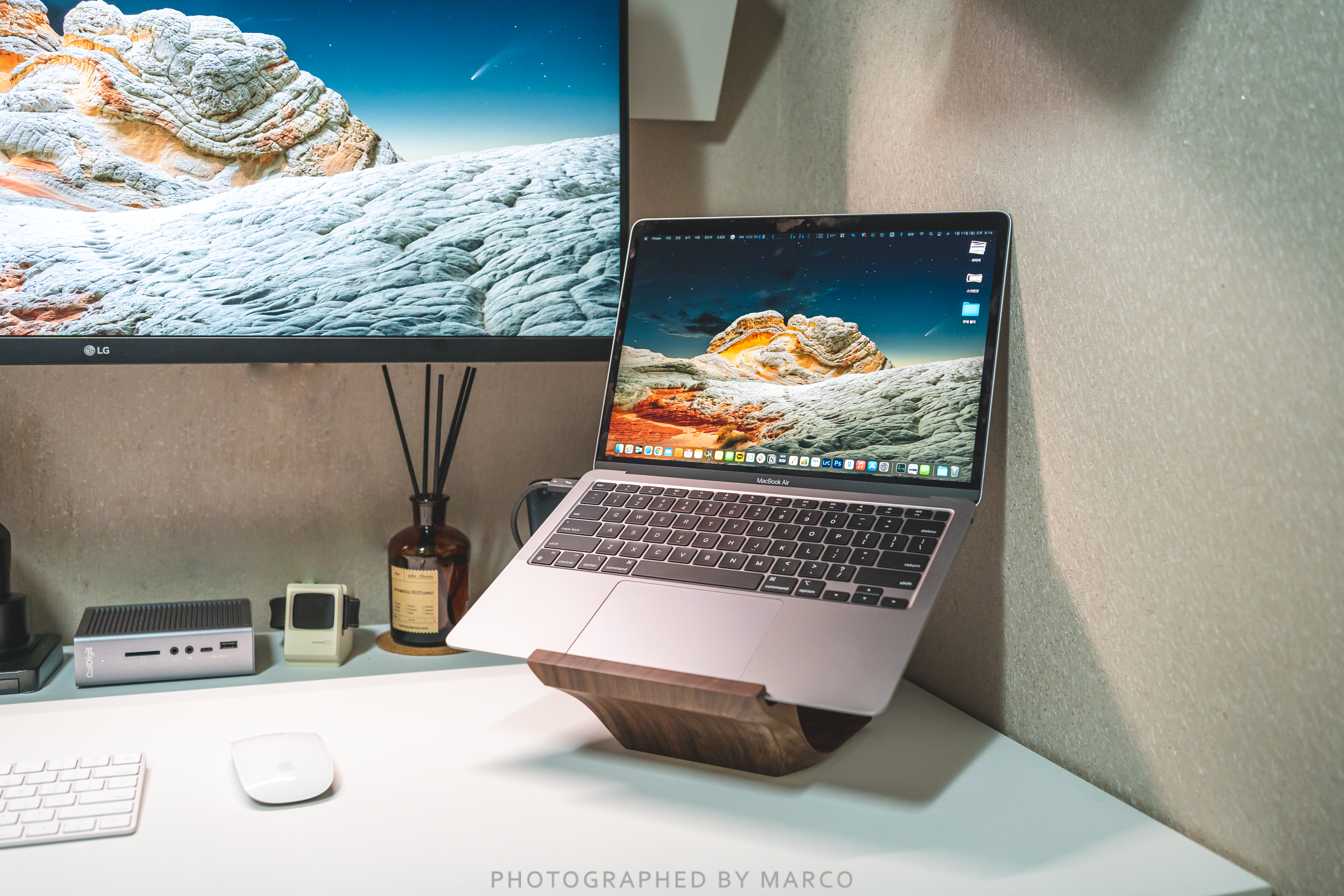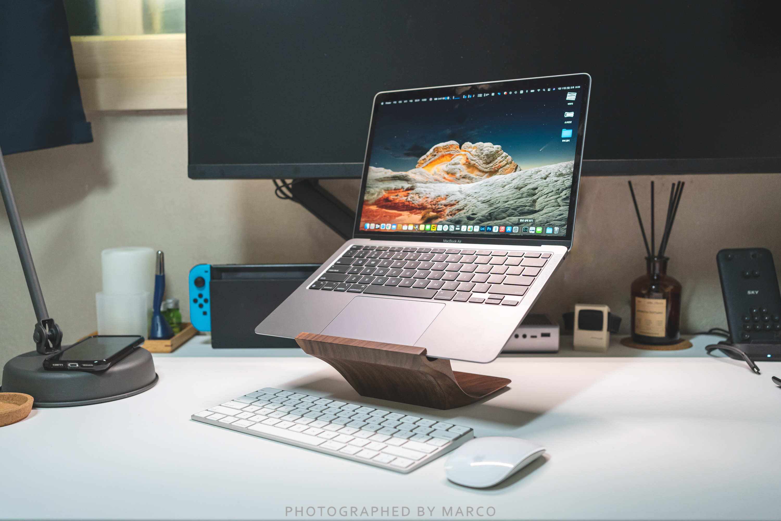 새로 구입한 맥북에어 M1 과 요한 B1 월넛 스탠드의 결합 모습