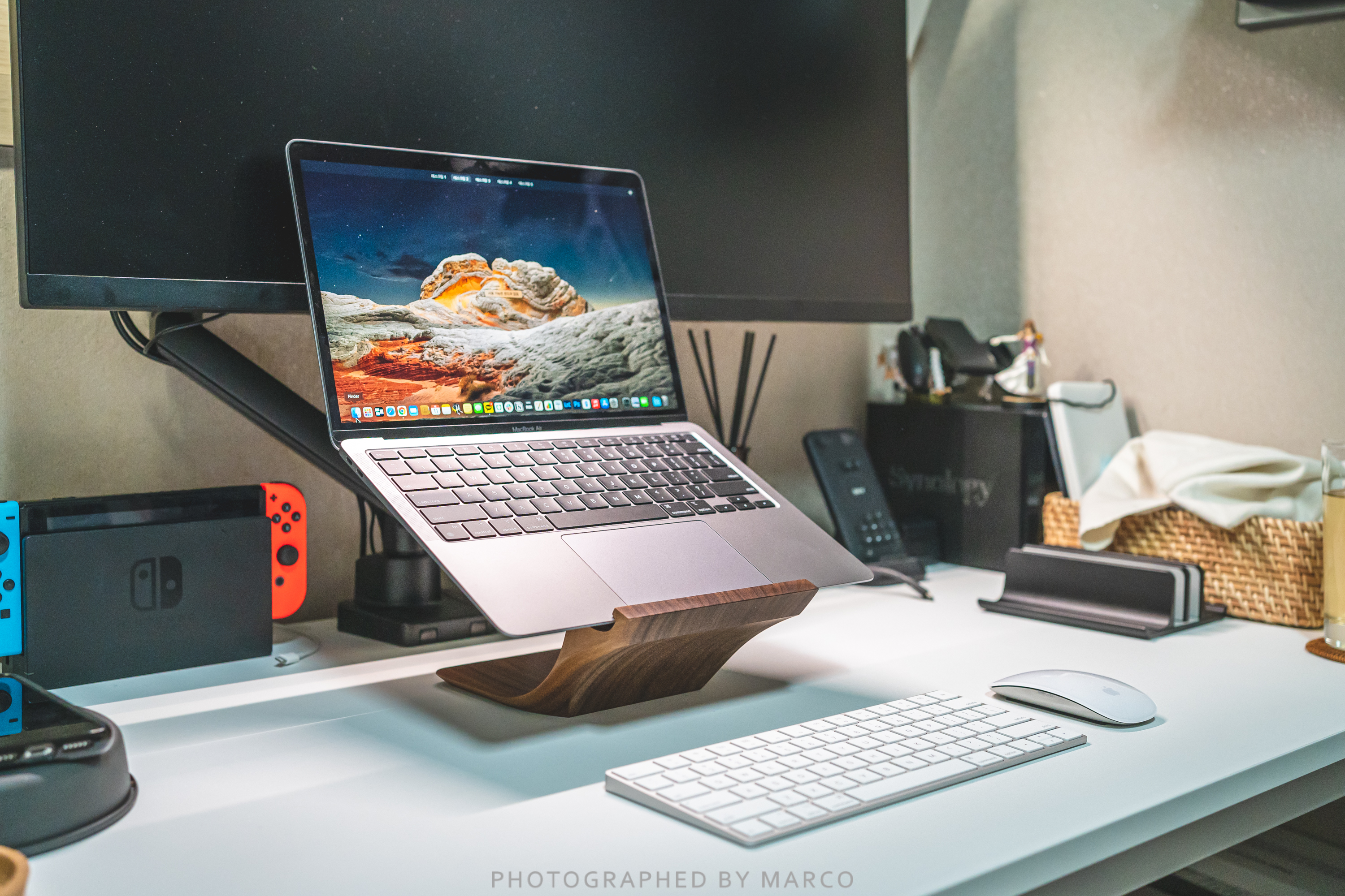 새로 구입한 맥북에어 M1 과 요한 B1 월넛 스탠드의 결합 모습