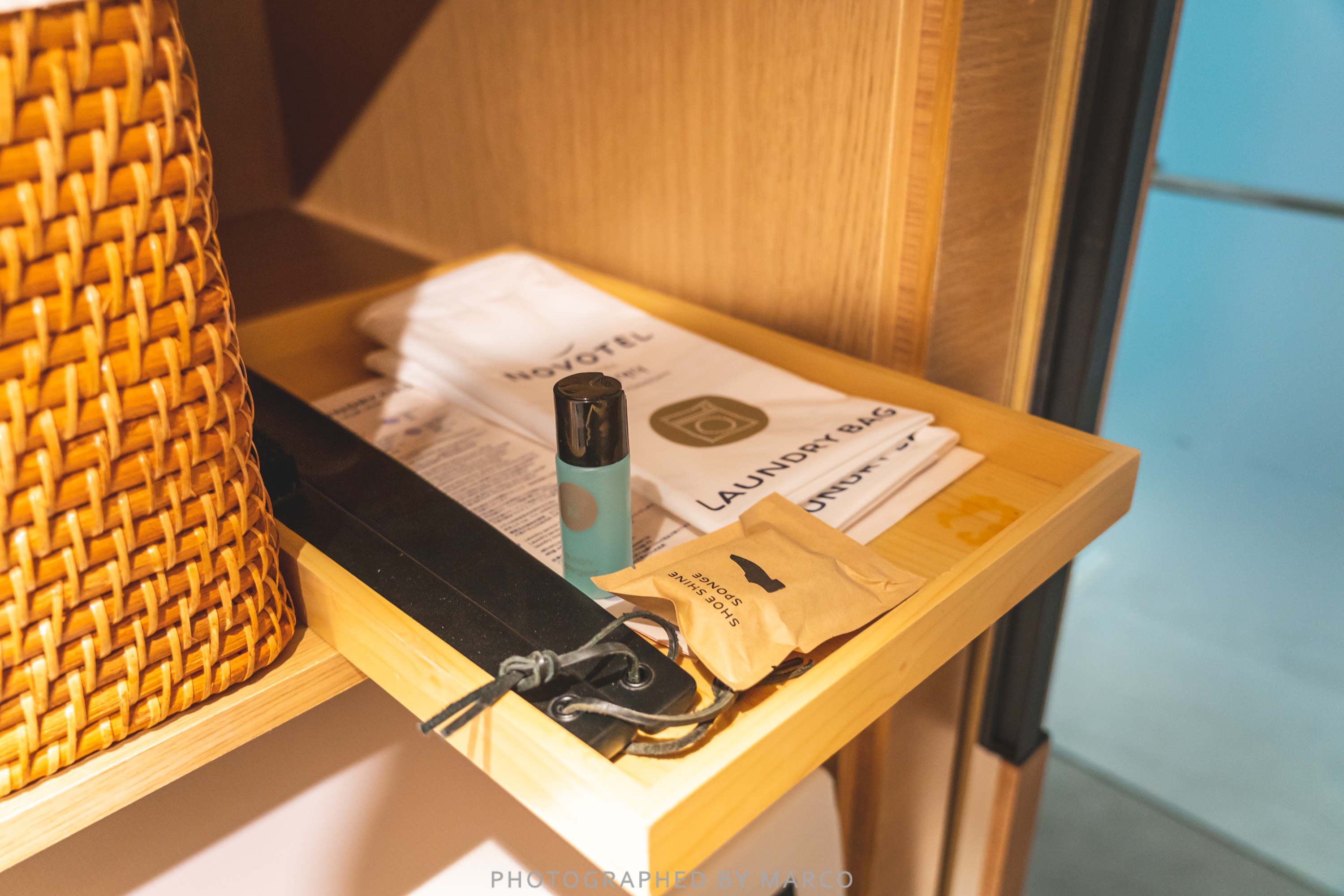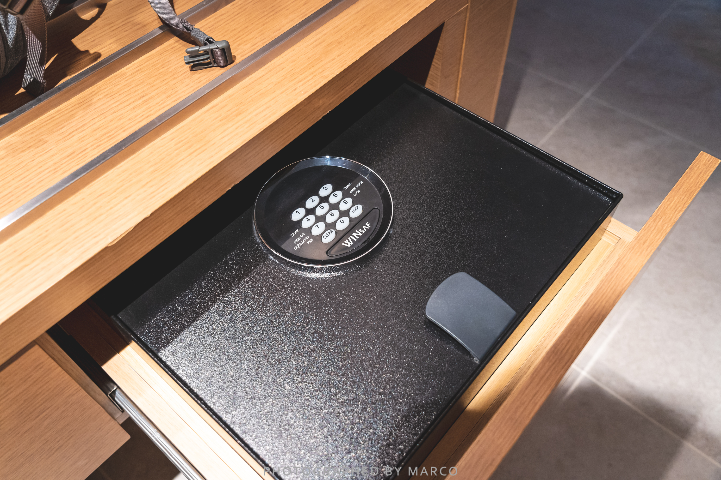 옷장 앞에는 캐리어 놓는 구역이 있고 서랍과 금고가 위치해 있다.
