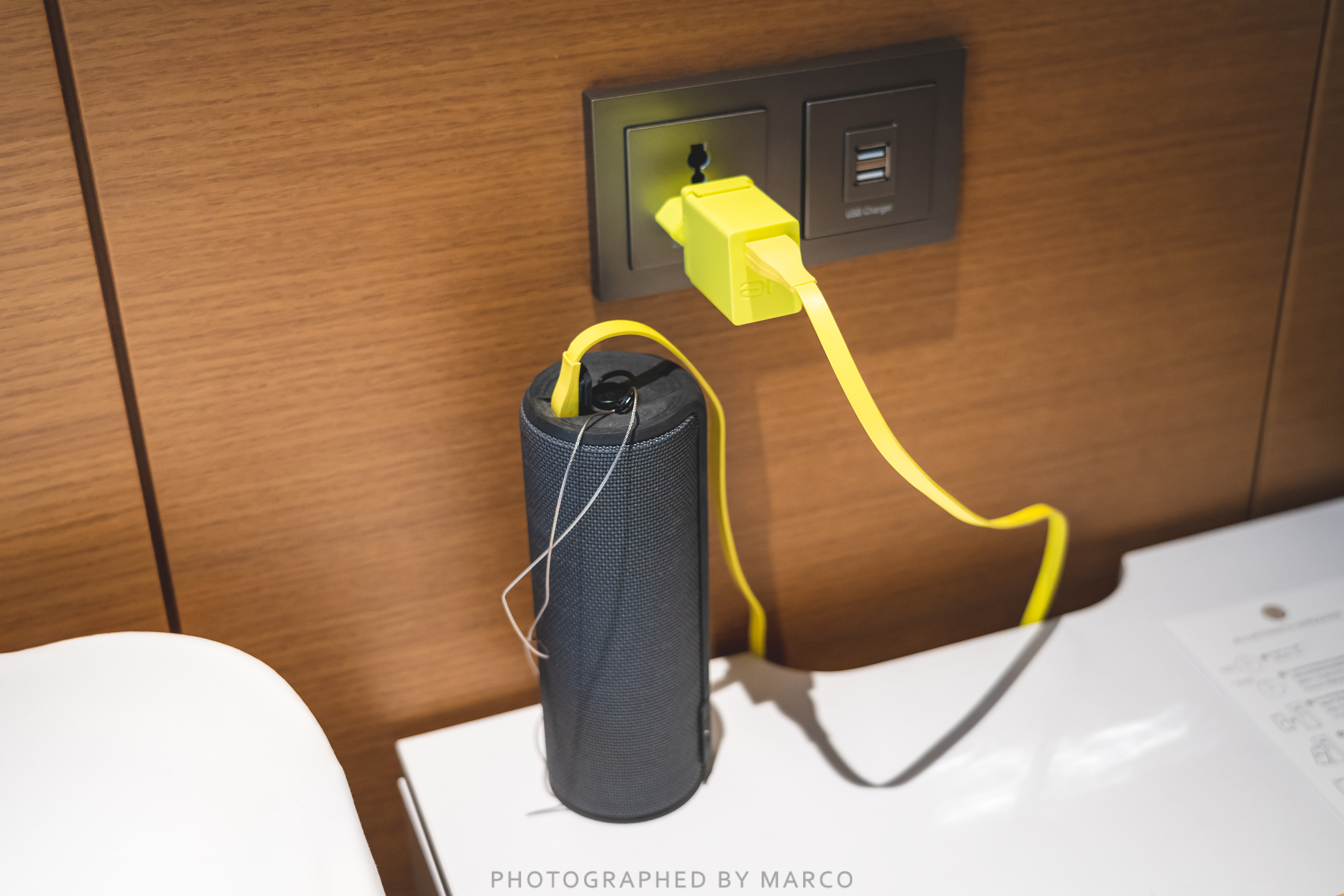 킹 사이즈 침대와, 블루투스 스피커, 스탠드 등이 위치해 있다.