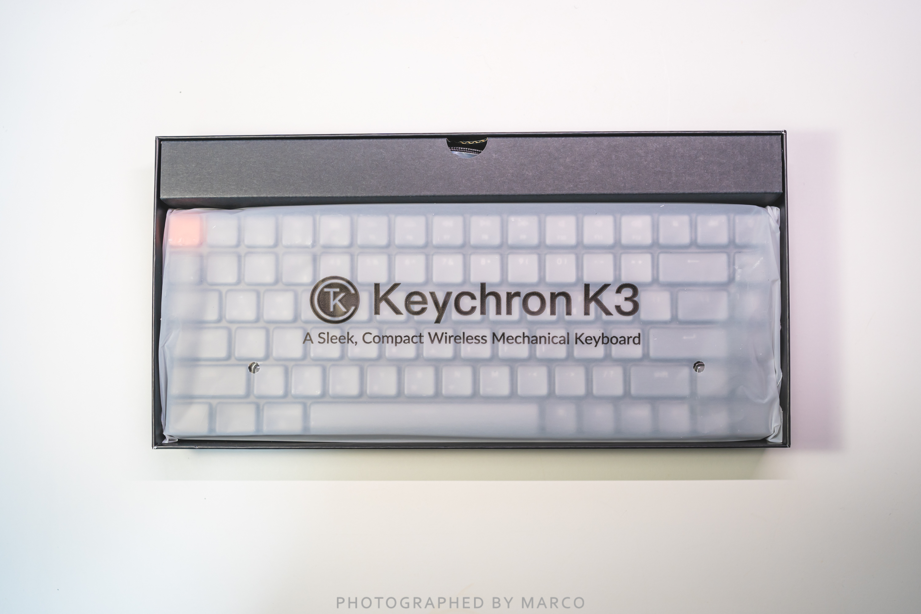 뚜껑을 열면 보호 케이스에 둘러싸인 키크론K3가 보인다.