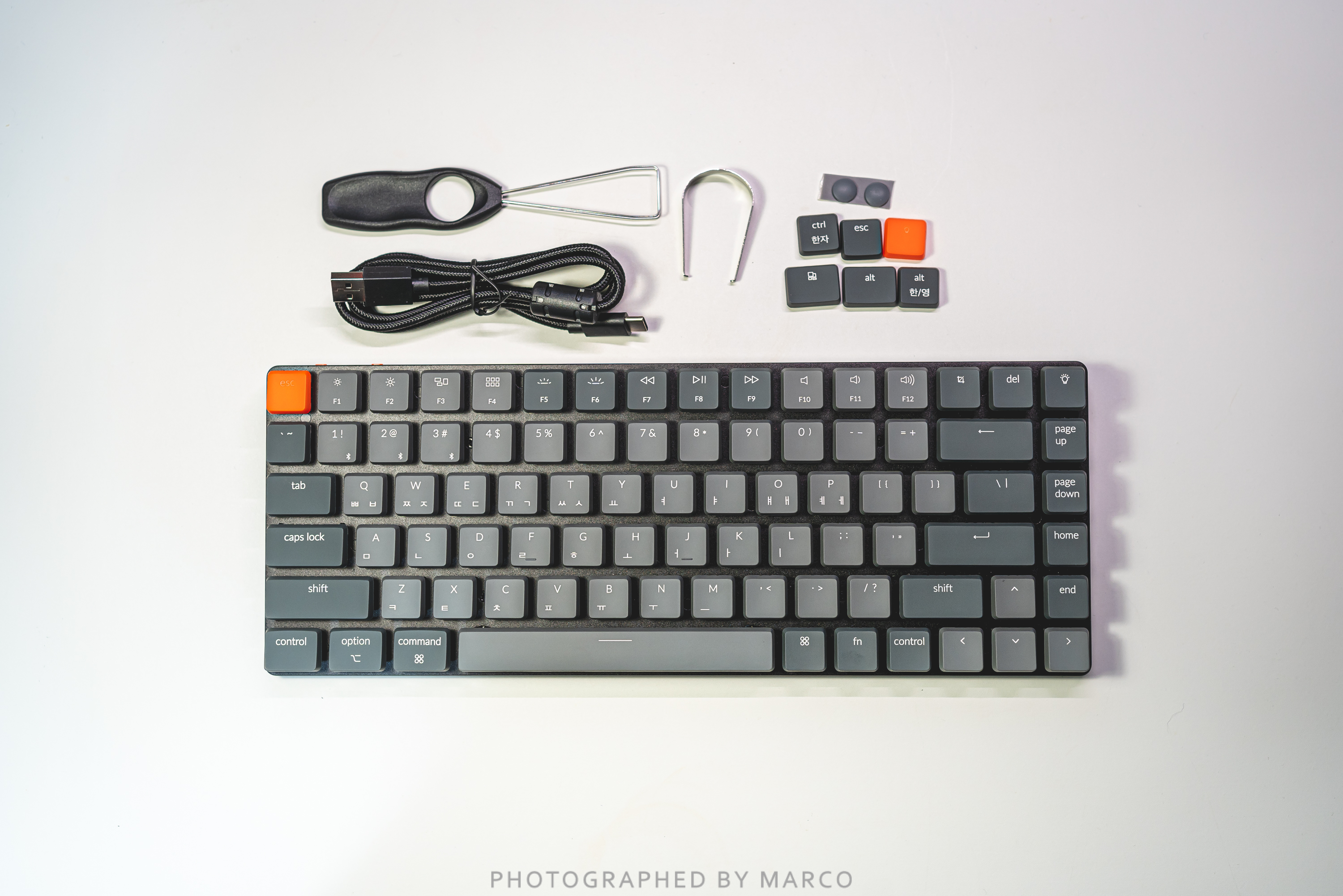 키크론 K3 본체, 충전선, 키캡 6개, 키캡 리무버, 스위치 리무버