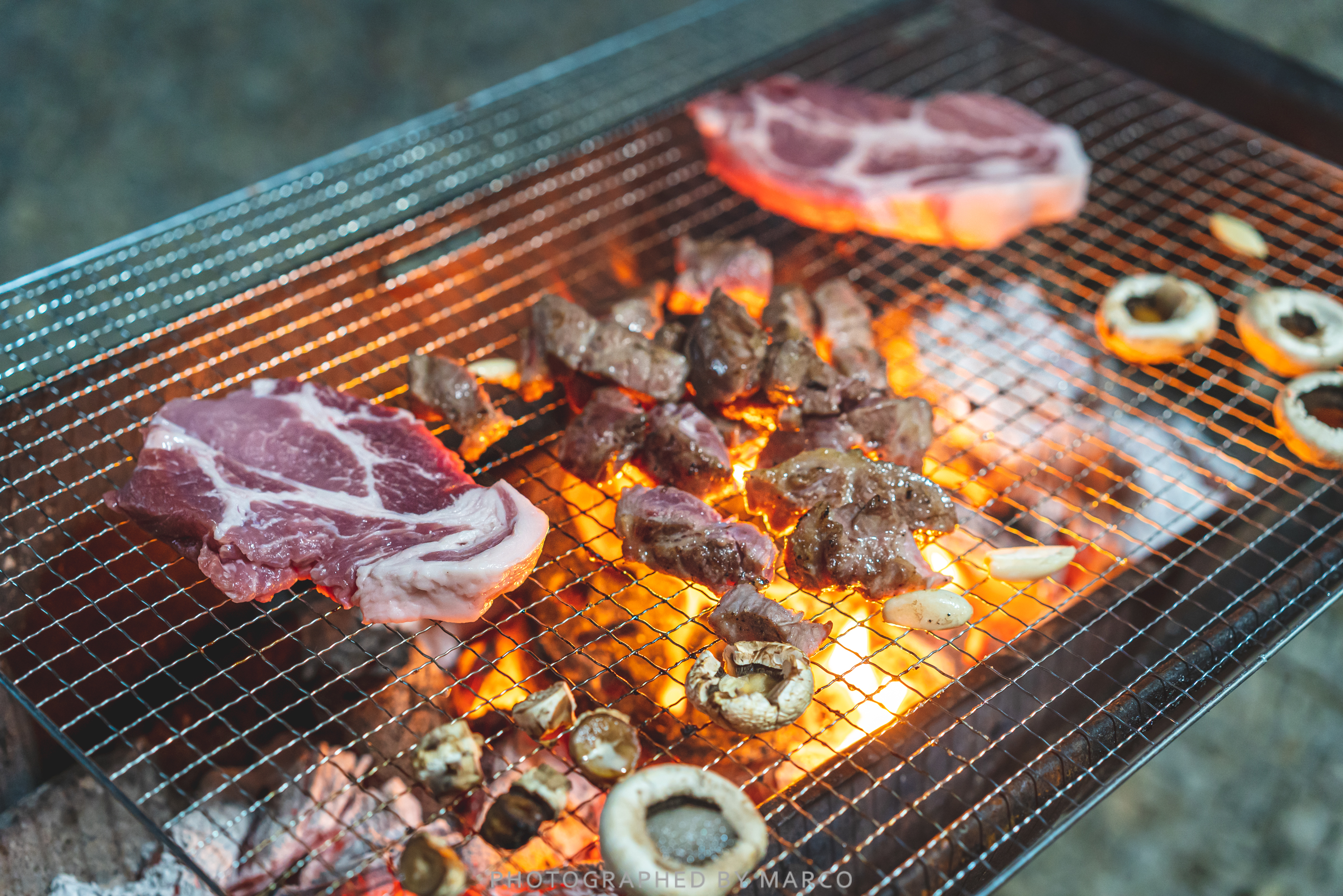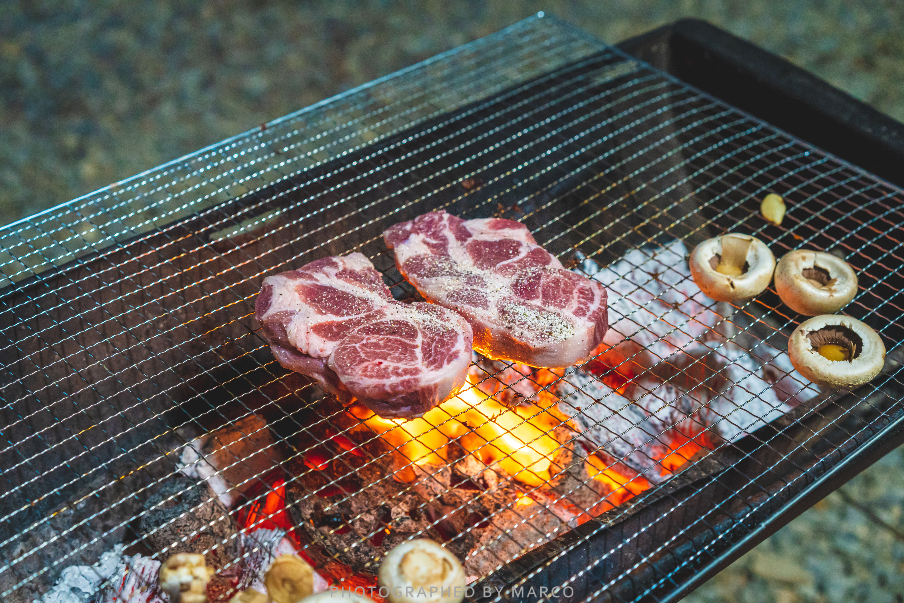 그릴에 바로 고기와 버섯 올리고 바베큐 시작~
