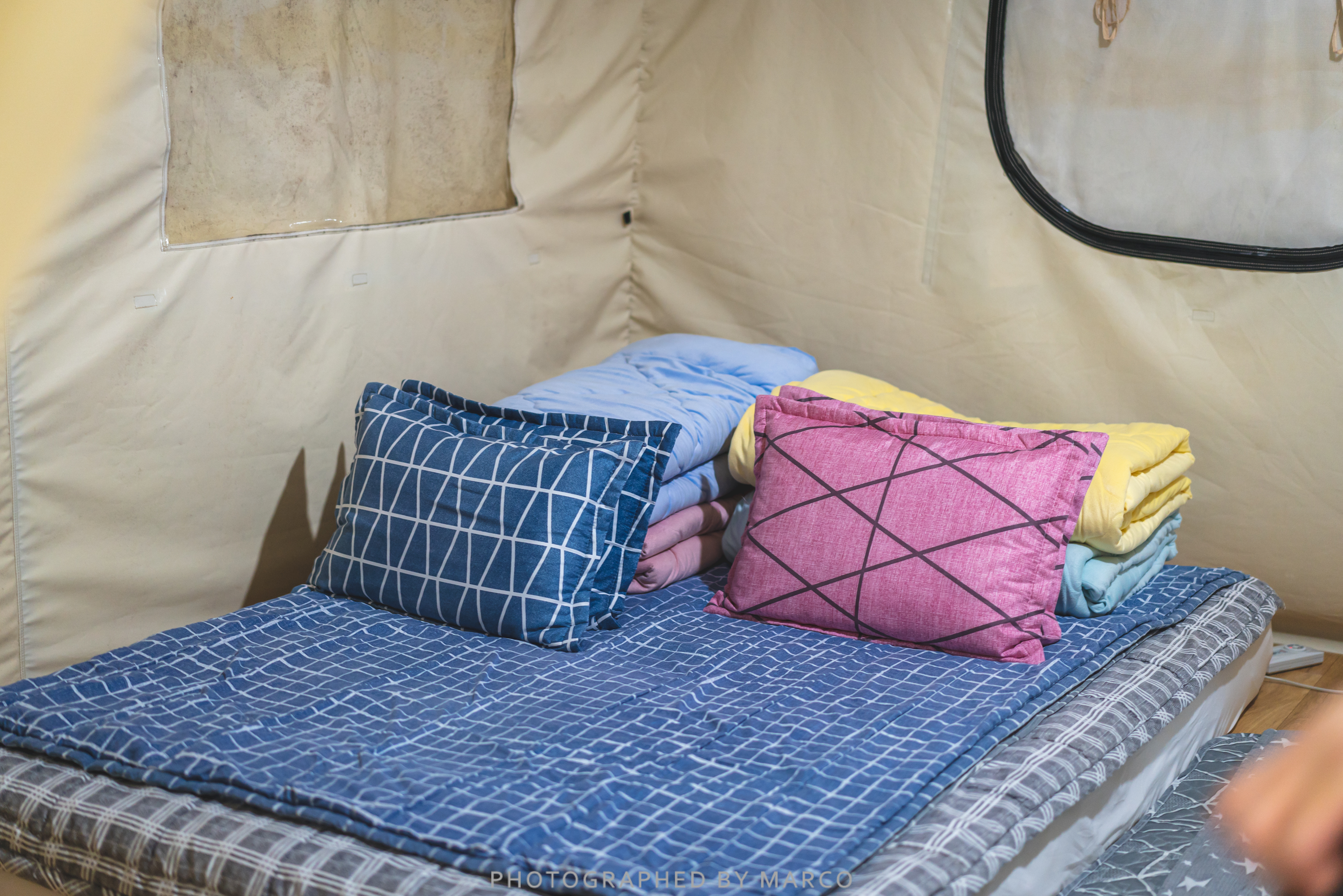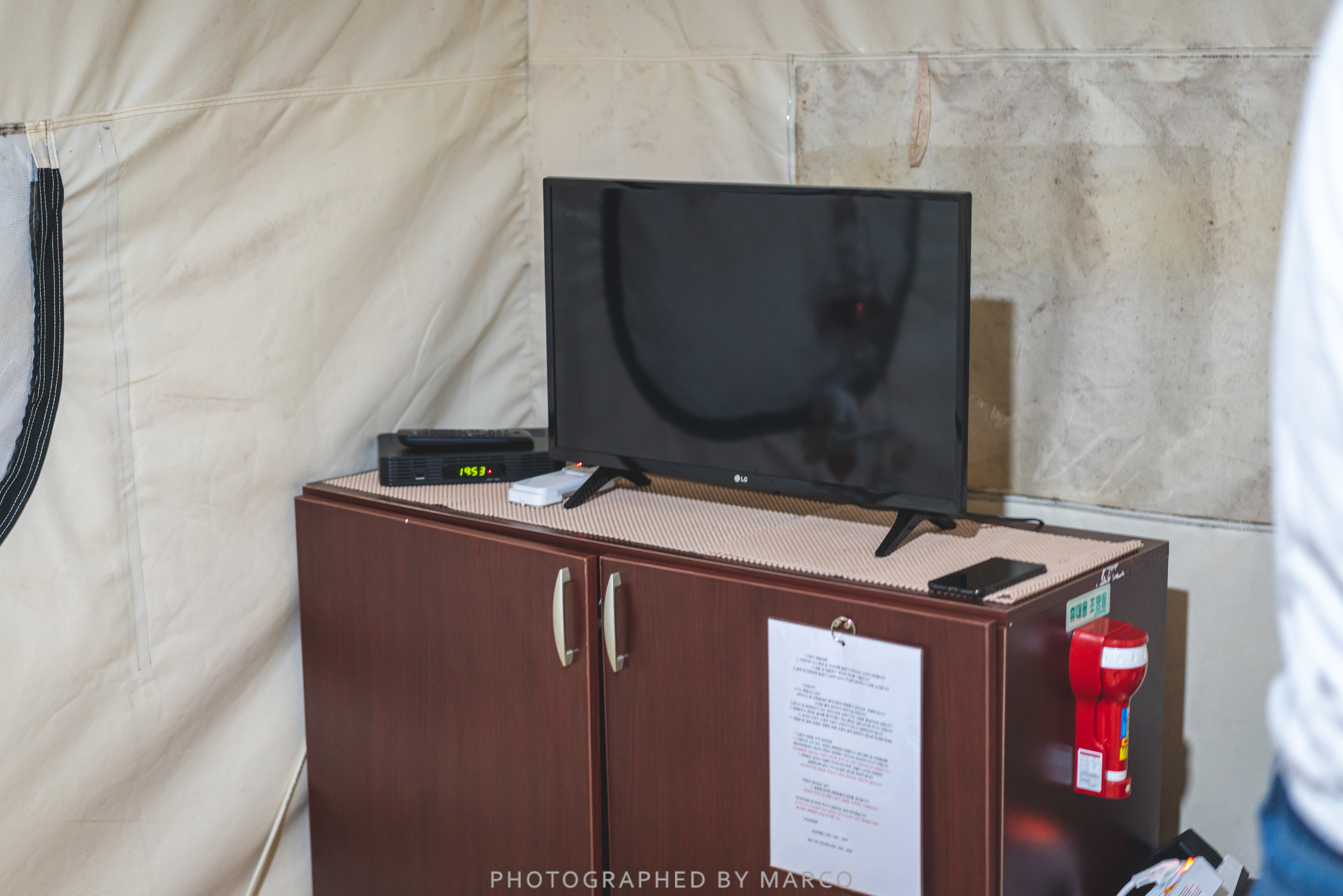 텐트 안에 준비된 침구류, 식기, TV 깔끔하다.