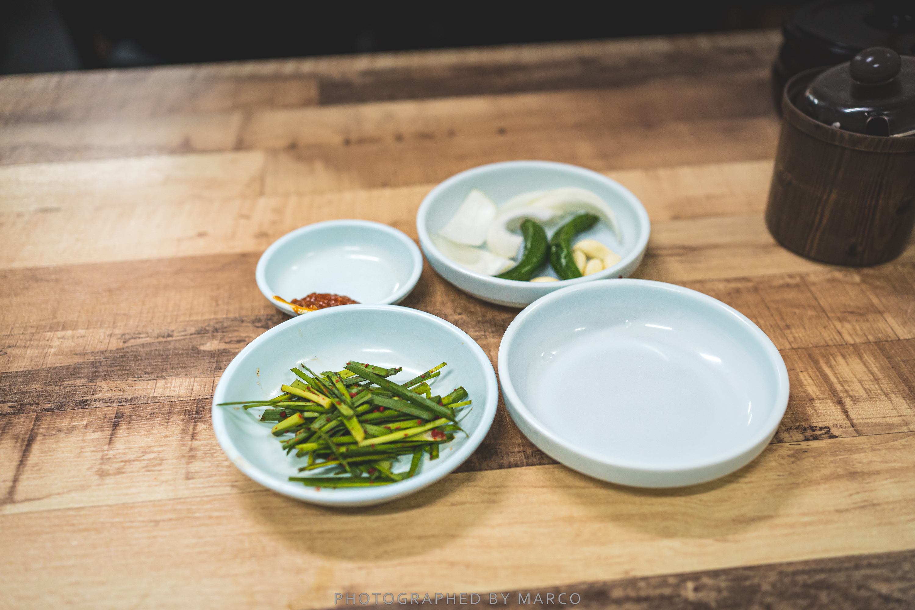 돼지국밥의 단짝 부추와 간단한 고추, 마늘, 양파가 나오고