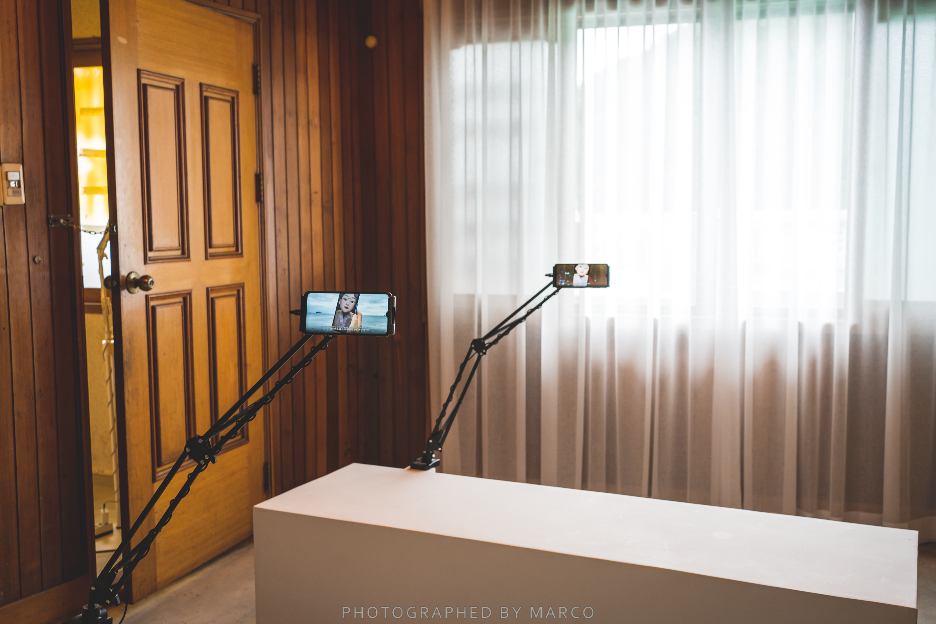 하루코는 스물세 살이 되던 해 해외 발령을 받은 신발 기술자 남편을 따라 부산에 정착하게 된다. 당시 한일 고무 기술 제휴로 일본의 많은 기술자가 부산으로 파견되었다. 어느 날 하루코는 남편에게 도시락을 가져다주려고 신발 공장에 갔다가 그곳에서 일하는 춘자를 만난다. 어쩐지 서로에게 끌리는 두 사람. 1945년 봄, 일본 고베에서 태어난 하루코(はるこ)와 같은 날 부산에서 태어난 춘자(春子). ‘봄의 아이’라는 뜻의 이름을 가진, 비슷한 운명을 타고난 그들에게 서로는 새로운 장소를 인식하는 좌표가 된다. 하루코에게 춘자는 내부로 향하는 골목이 되고, 춘자에게 하루코는 외부로 향하는 해로가 된다. 〈커스텀〉은 그들의 스마트폰을 따라가며 일어나는 미스터리 스릴러이다. 송민정은 가상의 인물을 매개로 특정한 환경을 설정하고 이를 스크린의 타임라인에 연결한다. 작가는 〈커스텀〉을 통해 현실 세계와 그 설정 사이에 형성되는 낙차 속에서 혼성된 세계를 바라보며 이동의 의미를 추적한다.