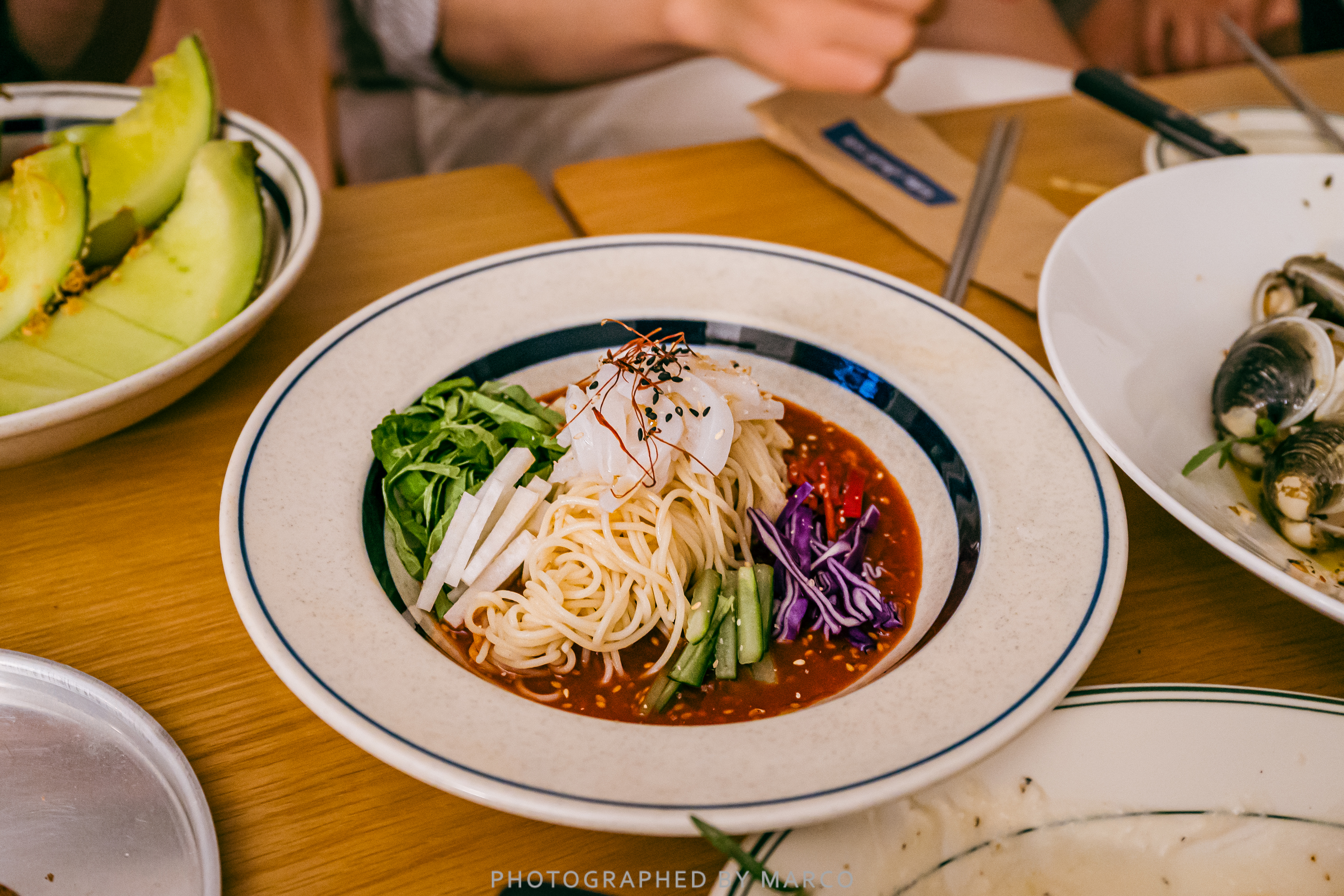 - 카펠리니면을 새콤한 소스와 함께 비벼 먹는 한치 비빔물회