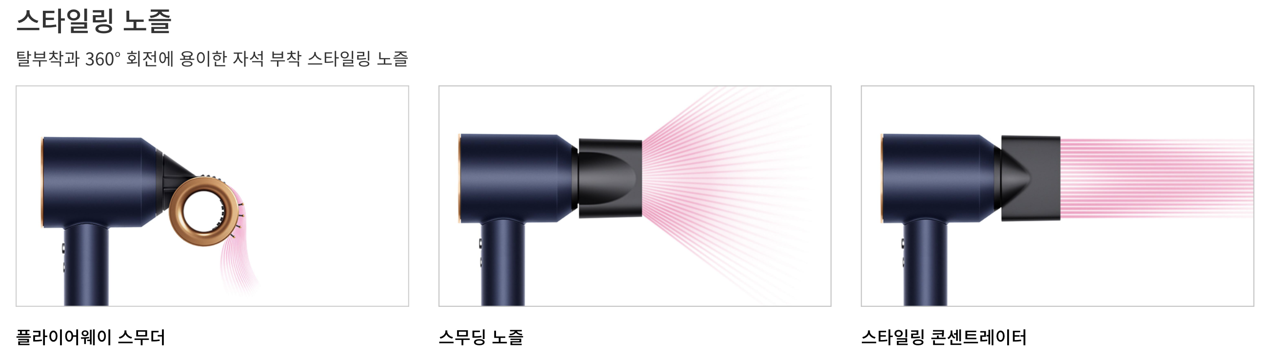 - 스무딩 노즐 : 스무딩 노즐은 부드럽고, 제어된 바람으로 부스스함을 줄여주고 매끄럽고 자연스러운 스타일을 연출합니다.