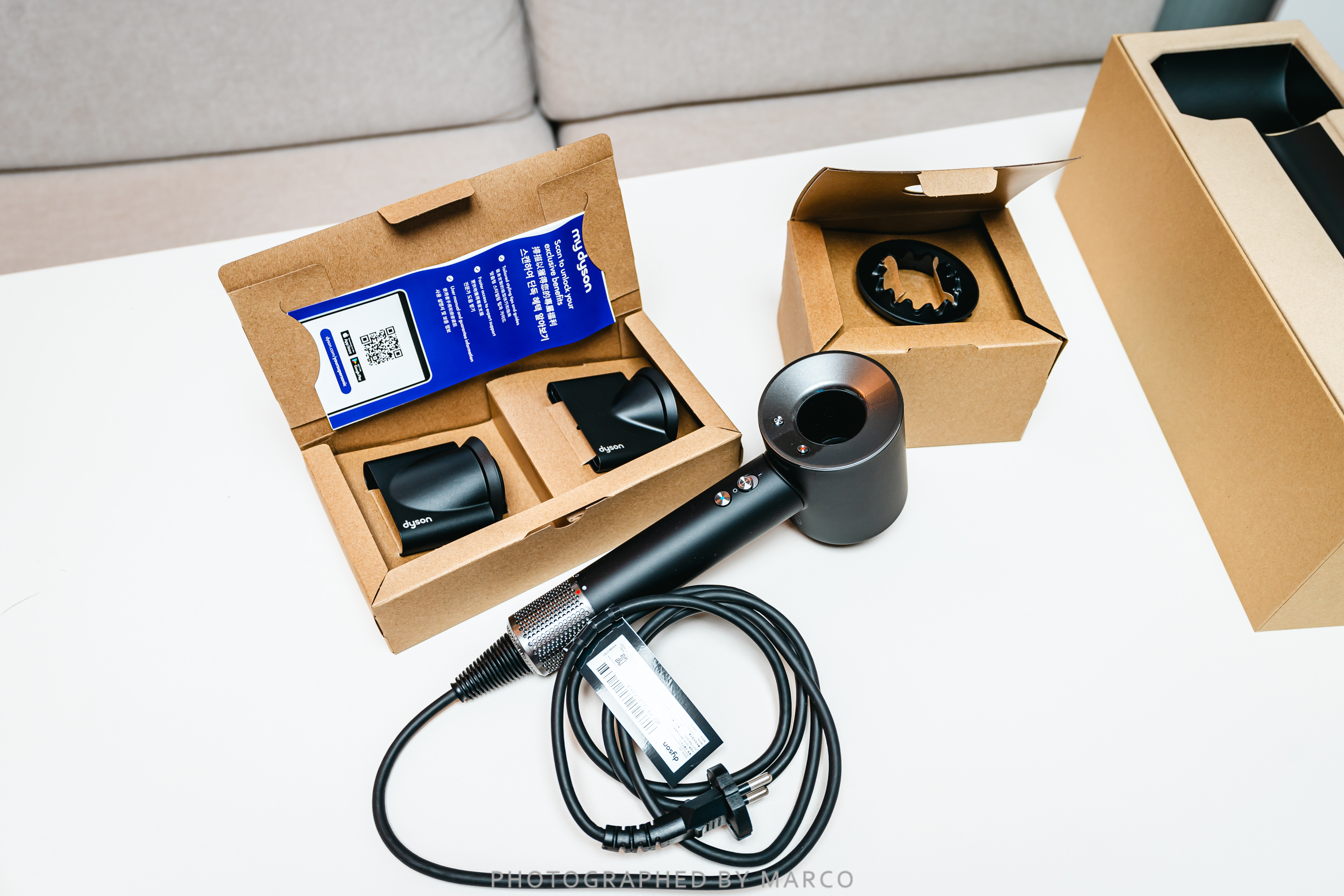 구성품은 'V9 모터가 탑재환 수퍼소닉 드라이어기 본체'와 4개의 노즐이 제공된다.